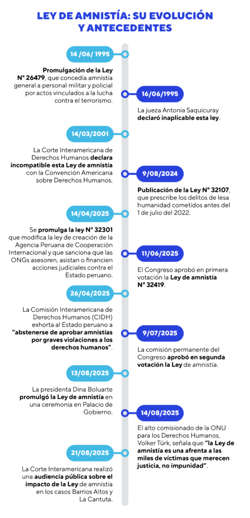 El 13 de agosto, la presidenta Dina Boluarte promulgó la Ley N° 32419, que concede amnistía a militares, policías y comités de autodefensa implicados en delitos durante la violencia interna (1980-2000). La mandataria defendió la medida como un acto de “honor” hacia los defensores del país. Además afirmó que rechaza “cualquier intromisión interna o externa” en alusión tanto a los cuestionamientos de organismos internacionales como a las críticas de familiares de víctimas que la consideran un golpe a la memoria y a la justicia.