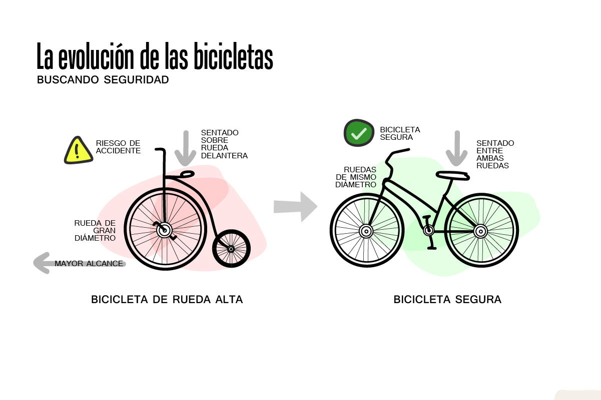 Las primeras bicicletas eran muy peligrosas, por eso, se trabajó en el concepto de “bicicleta segura”. Desde entonces, se ubica al ciclista en medio de las ruedas, reduciendo significativamente el número de accidentes. Se sigue trabajando en modelos que rompan el esquema tradicional, pero ello implica modificar la ubicación de los cinco puntos antes mencionados. Por ejemplo, en la ciudad destacan las bicicletas recumbentes en las que el usuario debe reclinarse por completo y dirigir el vehículo desde timones laterales; las bicicletas plegables de ruedas pequeñas; y las choppers, que cambian notablemente la ubicación de sus puntos funcionales. Las bicicletas deportivas como las de carretera, las montañeras o de trekking bajan la posición del timón para favorecer una postura más aerodinámica en el usuario.