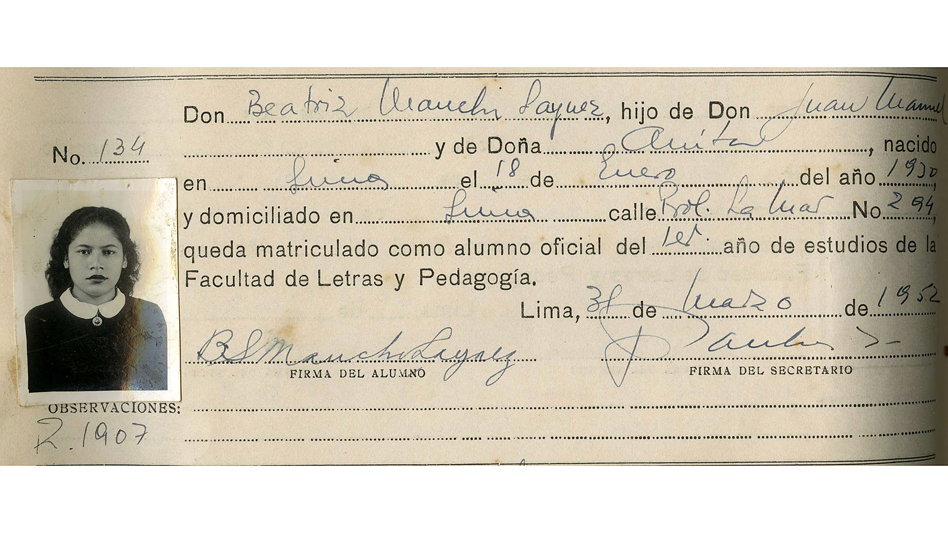 En nuestra Universidad, Beatriz Mauchi estudió Educación Secundaria en la Especialidad de Lingüística y Literatura. Posteriormente, llevó también el Doctorado en Educación, en una época en que aún no era muy común que las mujeres tuvieran la oportunidad de seguir estudios superiores.