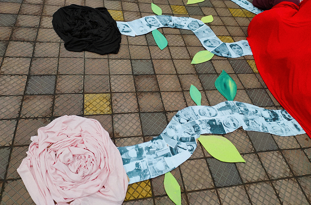 Unas flores hechas de tela se posan al finalizar las venas y arterias. Son rojas, moradas, rosadas y también de tonos oscuros, acaso mostrando la esperanza de un futuro mejor, pero sin disimular la tristeza que nos rodea.