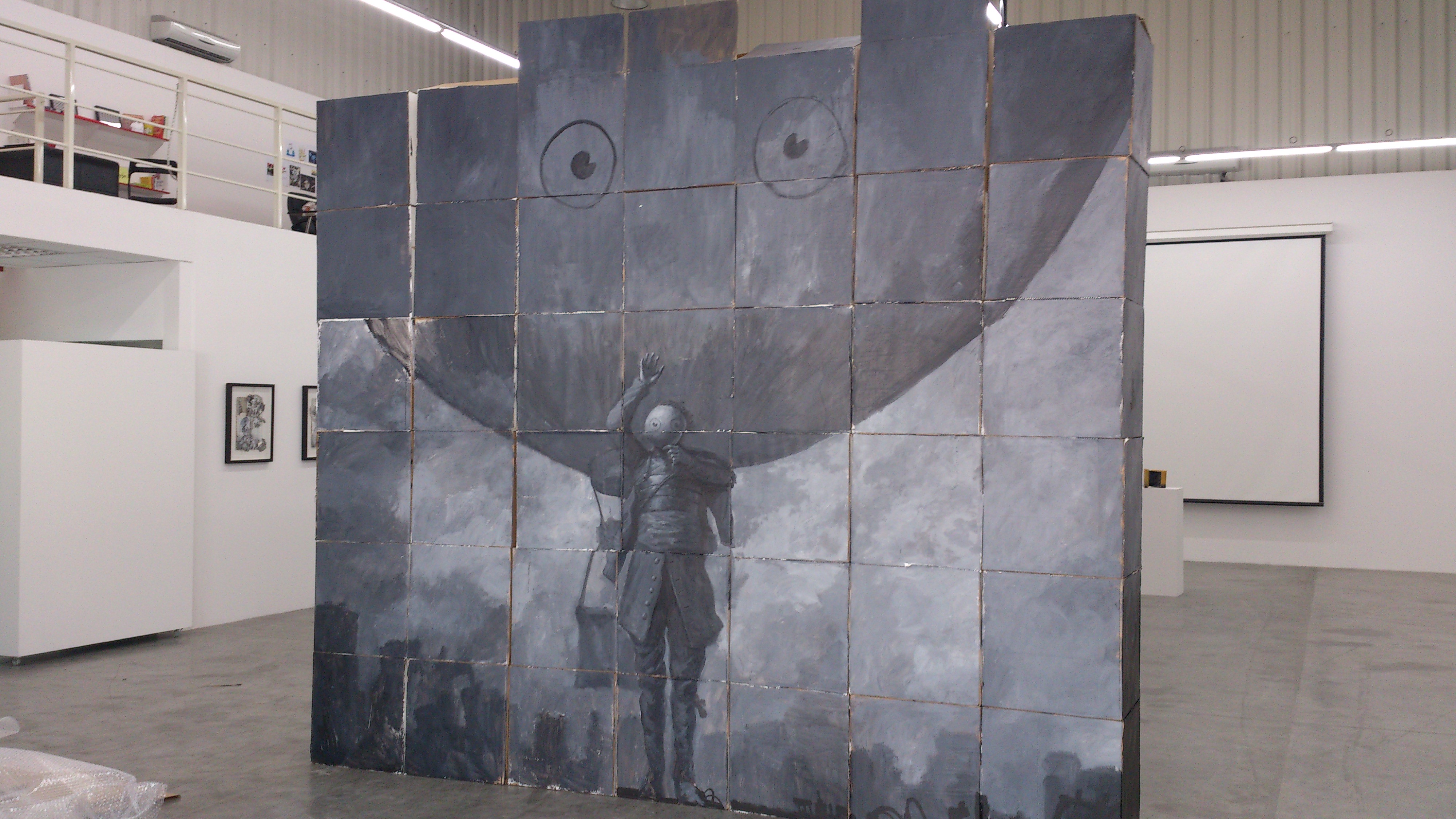 La obra principal de la exposición consta de un grupo de tres piezas armadas con cajas de cartón, “el hecho que estas se puedan armar y desarmar me atraía mucho, de esta manera, dan una sensación de temporalidad e inestabilidad”, menciona Germán y explica que en cada lado de una caja, como en un cubo mágico, se muestra una imagen distinta, “para mi toda historia tiene muchas versiones, tantas como los actores que intervienen en ella”, agrega.