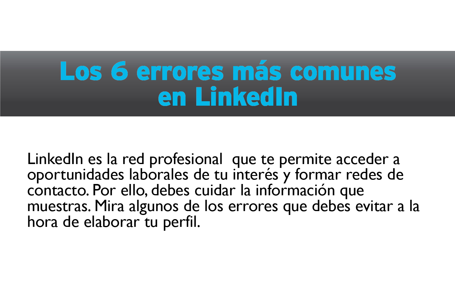 LinkedIn es la red profesional más grandes del mundo. Reconocemos la importancia de esta red en la búsqueda de empleo y en la creación de redes de contacto. Por ello, debes cuidar la información que compartes y la imagen que proyectas a través de la red. Conoce cuáles son algunos de los errores que debes evitar al momento de elaborar tu perfil.