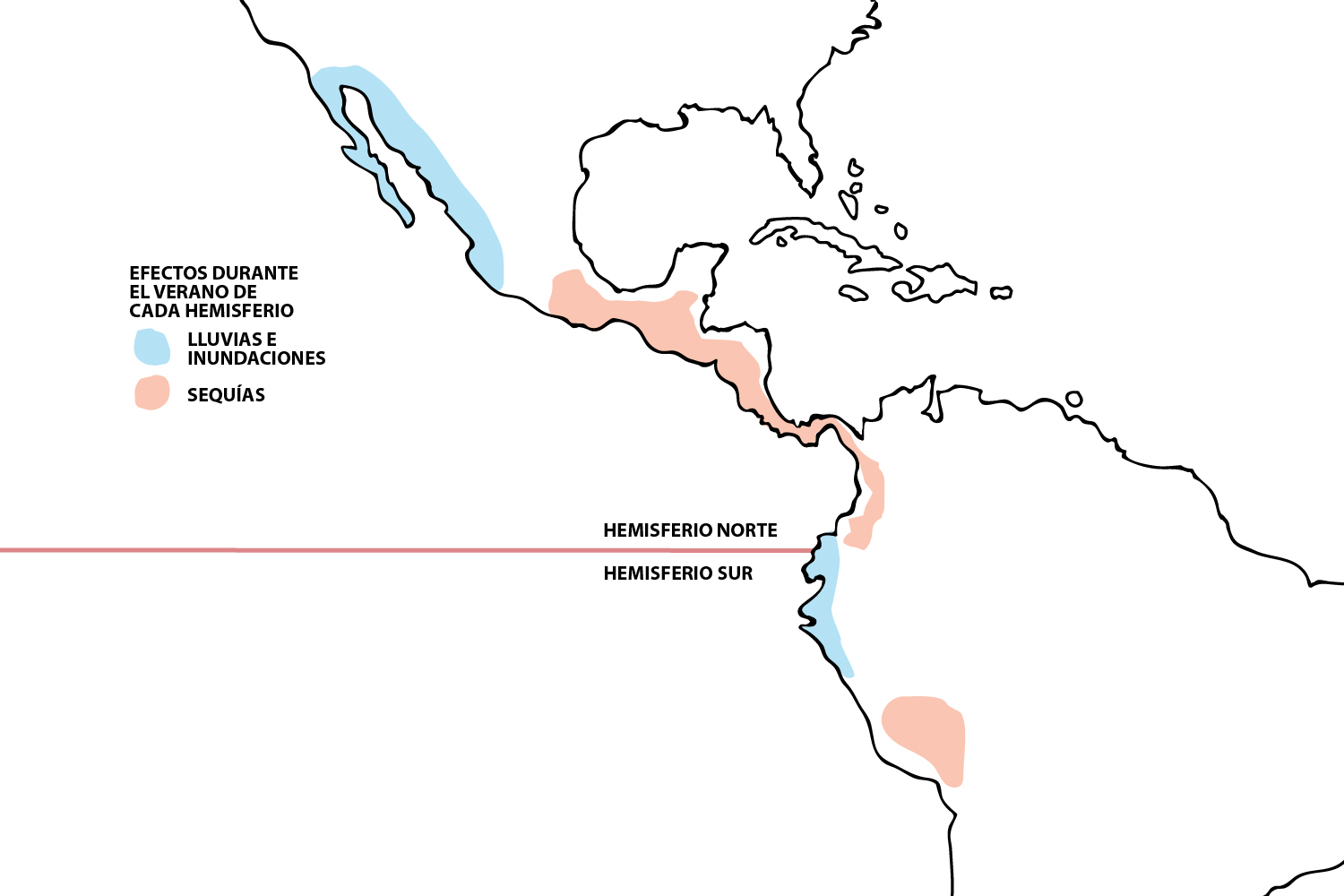 El especialista explica que los efectos del Fenómeno El Niño que tenemos actualmente se dividen por ambos hemisferios. Las aguas que van hacia el Hemisferio Norte avanzan por el golfo de Guayaquil, Panamá, Centro América, hasta California. Las corrientes cálidas se calientan más por el verano lo que conlleva a que centroamérica sufra por sequías y en el norte de México y California tengan lluvias torrenciales e inundaciones. Por otro lado, las aguas que van para el Hemisferio Sur avanzan por Tumbes, Piura, la costa de Lambayeque y La Libertad. Pero como estamos en invierno, El Niño es muy débil para nosotros y a Chile le corresponden inviernos suaves, cuando están acostumbrados a inviernos tan crudos.