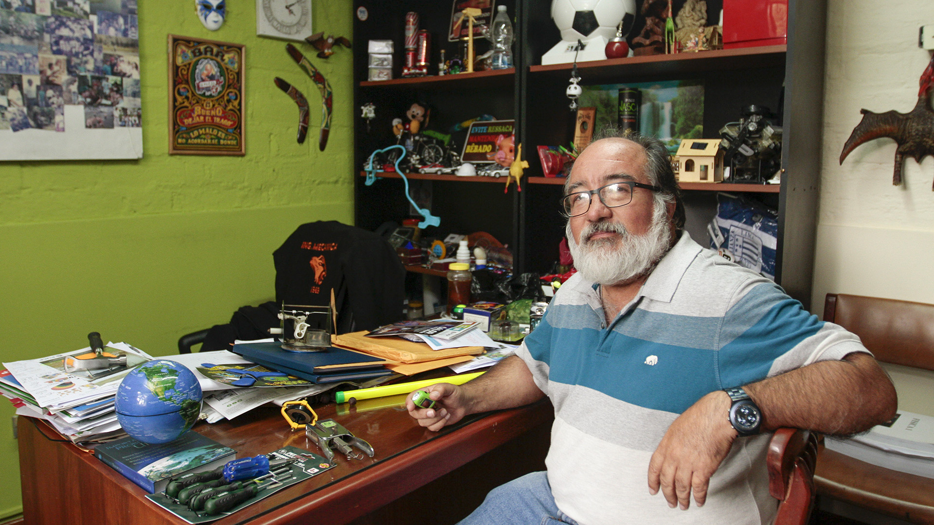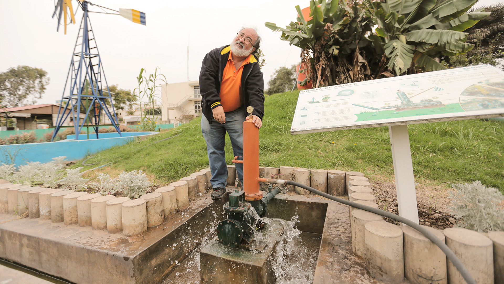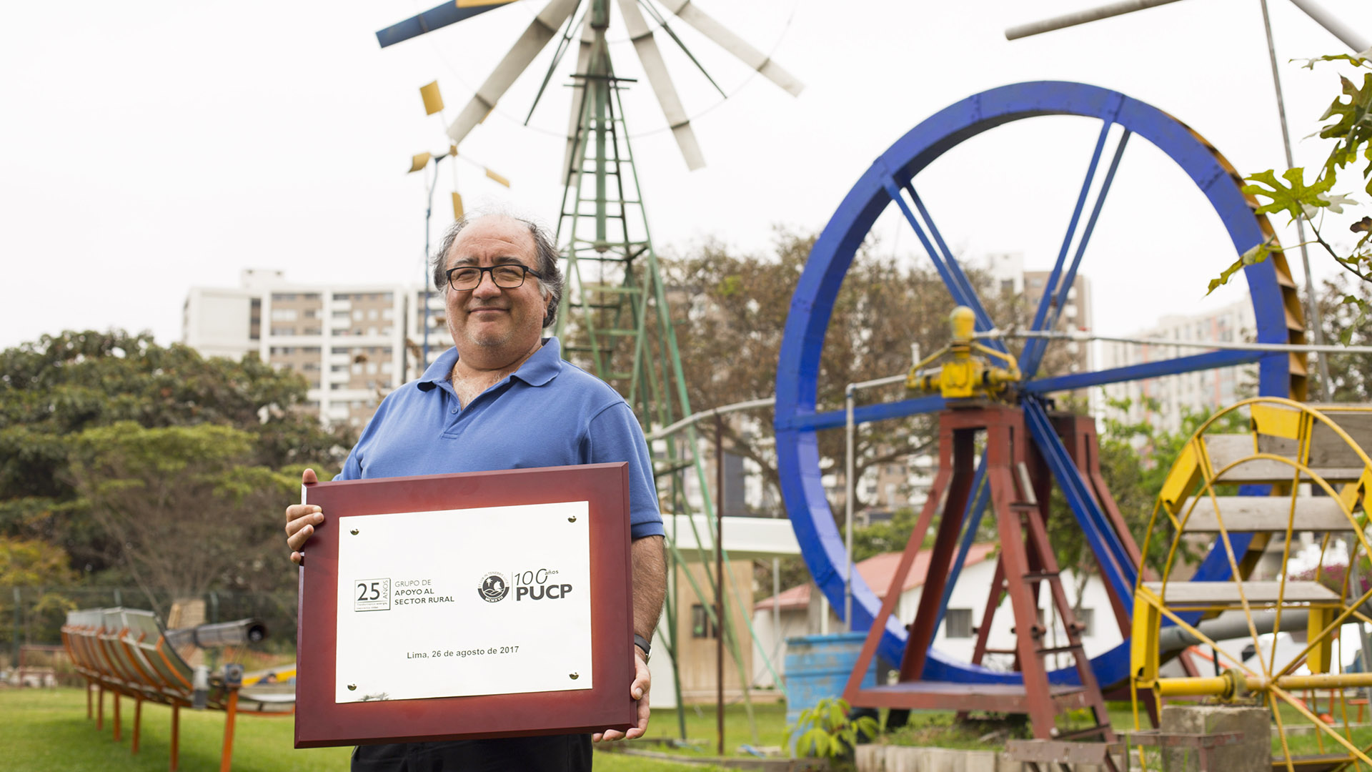 En la oficina donde se coordinaron tantos proyectos de desarrollo e innovación tecnológica. Con el subibaja y el molino de viento en el amplio bosque del Grupo PUCP, donde se fabricaban y exhibian sus desarrollos tecnológicos. Miguel Hadzich fue investigador y docente de nuestro Dpto. de Ingeniería. Ingresó a la PUCP en 1975 para estudiar Ingeniería Mecánica. En 1992, Miguel fundó el Grupo de Apoyo al Sector Rural, conocido como GRUPO PUCP, donde realizó decenas de proyectos de desarrollo de tecnologías sostenibles en diversas partes del Perú. El trabajo de campo fue vital para Miguel, quien inculcó en sus estudiantes la pasión por poner en práctica la teoría de la ingeniería. Sus proyectos solían integrar saberes de varias disciplinas. Con una placa conmemorativa por el 25 aniversario del GRUPO PUCP, que se cumplieron en el 2017, año del centenario de nuestra Universidad.