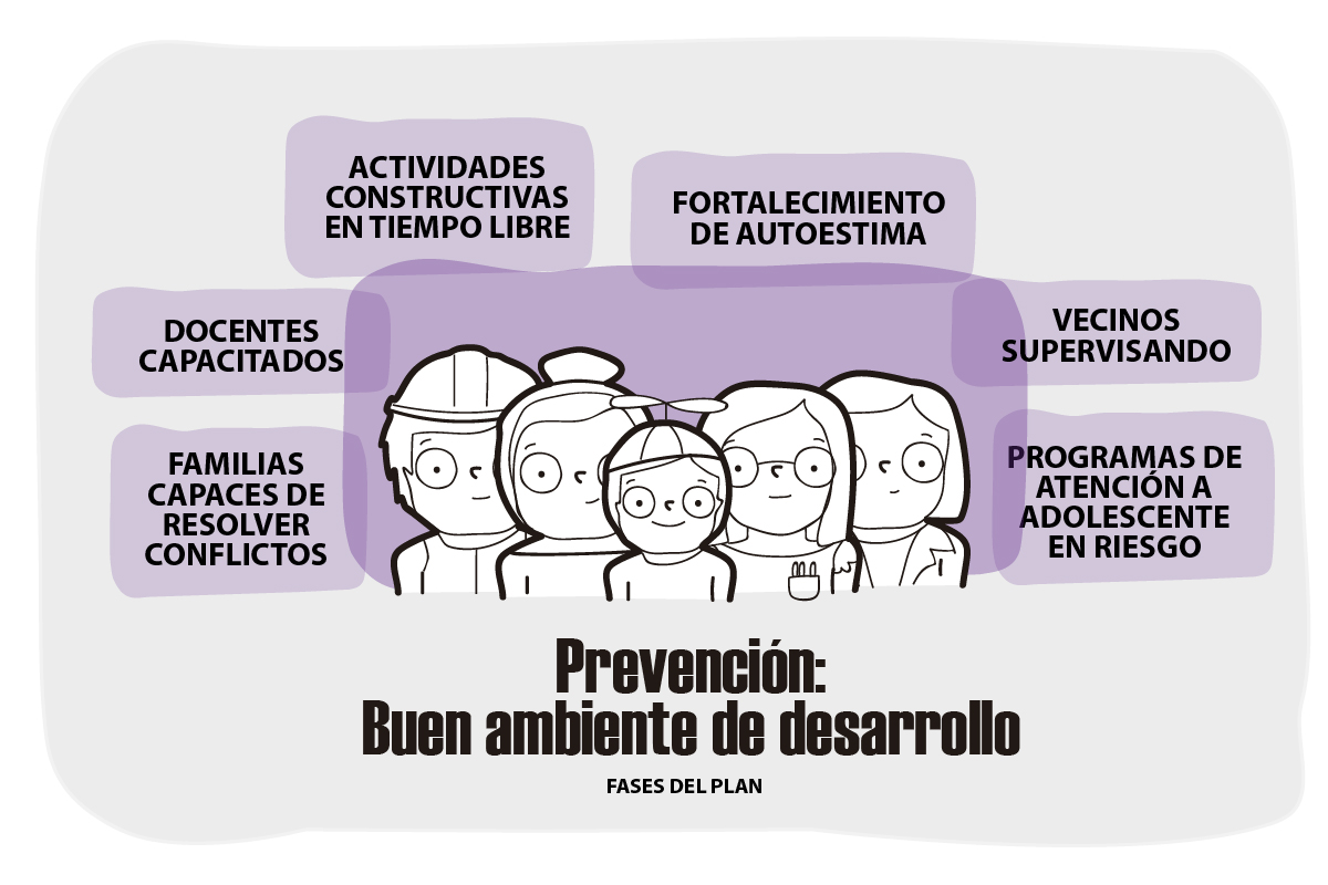El trabajo de prevención recae principalmente en el Estado, específicamente al ejecutar el Plan Nacional de Prevención y Tratamiento del Adolescente en Conflicto con la Ley Penal, el primer programa que aprobó el Consejo Nacional de Política Criminal del gobierno actual, para que el adolescente tenga un tratamiento especialmente preventivo. “Sería contradictorio que una política pública aprobada por este mismo gobierno, ahora, quiera dejarse de lado y se piense en endurecer el marco punitivo”, asevera Meini. La Policía Nacional del Perú tiene programas piloto en Trujillo y Lima para demostrar que hay formas distintas para intentar reducir el problema, y, aunque requieren presupuesto y tiempo, están funcionando.