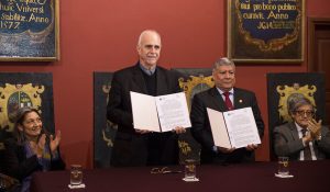 La PUCP junto con la UNMSM y la UNSA de Arequipa crearán la Cátedra Perú, que se dictará en la Universidad de Salamanca (España). Nuestro rector recibió al Dr. Ricardo Rivero, rector de la USAL, para firmar la declaración que da inicio a este gran proyecto.