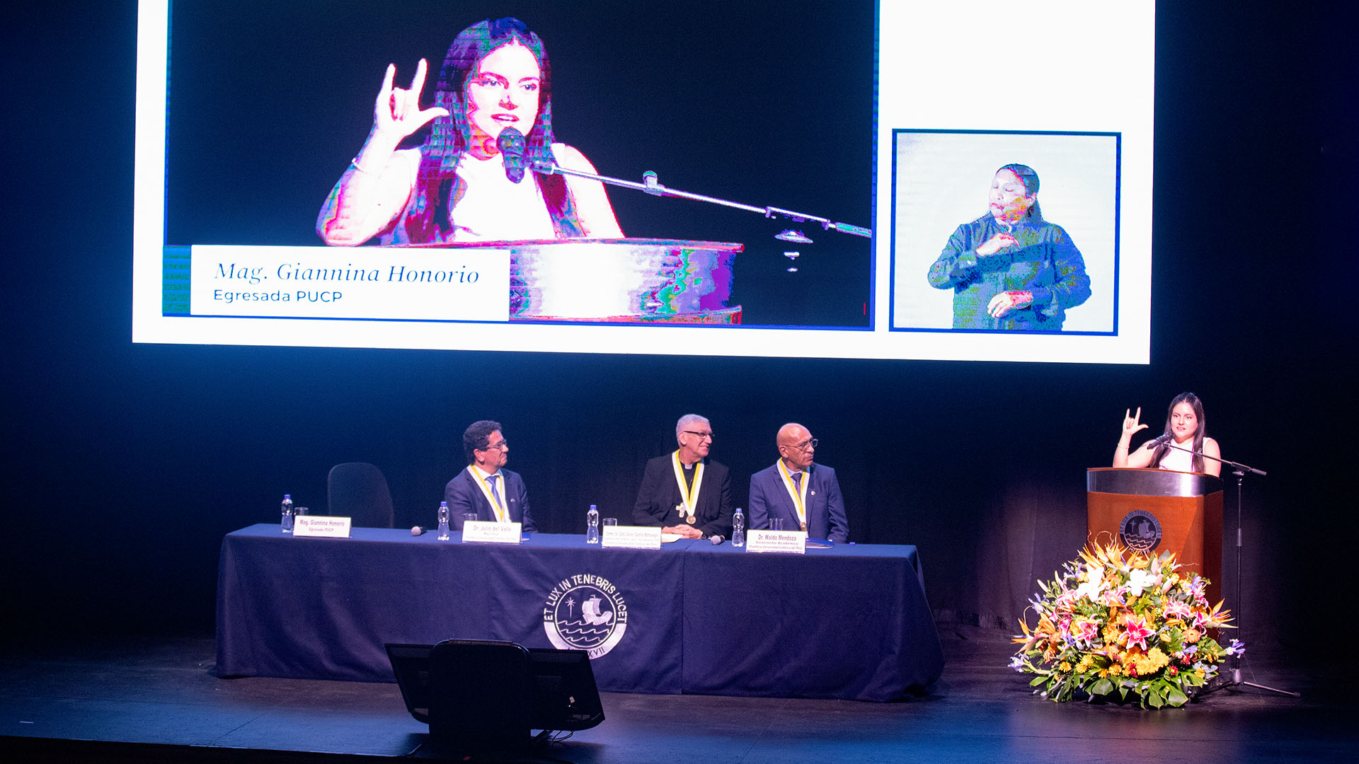 Soy Giannina Honorio, egresada de esta casa de estudios, y estoy muy contenta de sentir nuevamente la energía de la PUCP. Porque la PUCP no es solo un lugar: es su gente. La comunidad PUCP es una comunidad de excelencia. Y eso es extremadamente valioso en un mundo cada vez menos físico y más digital.