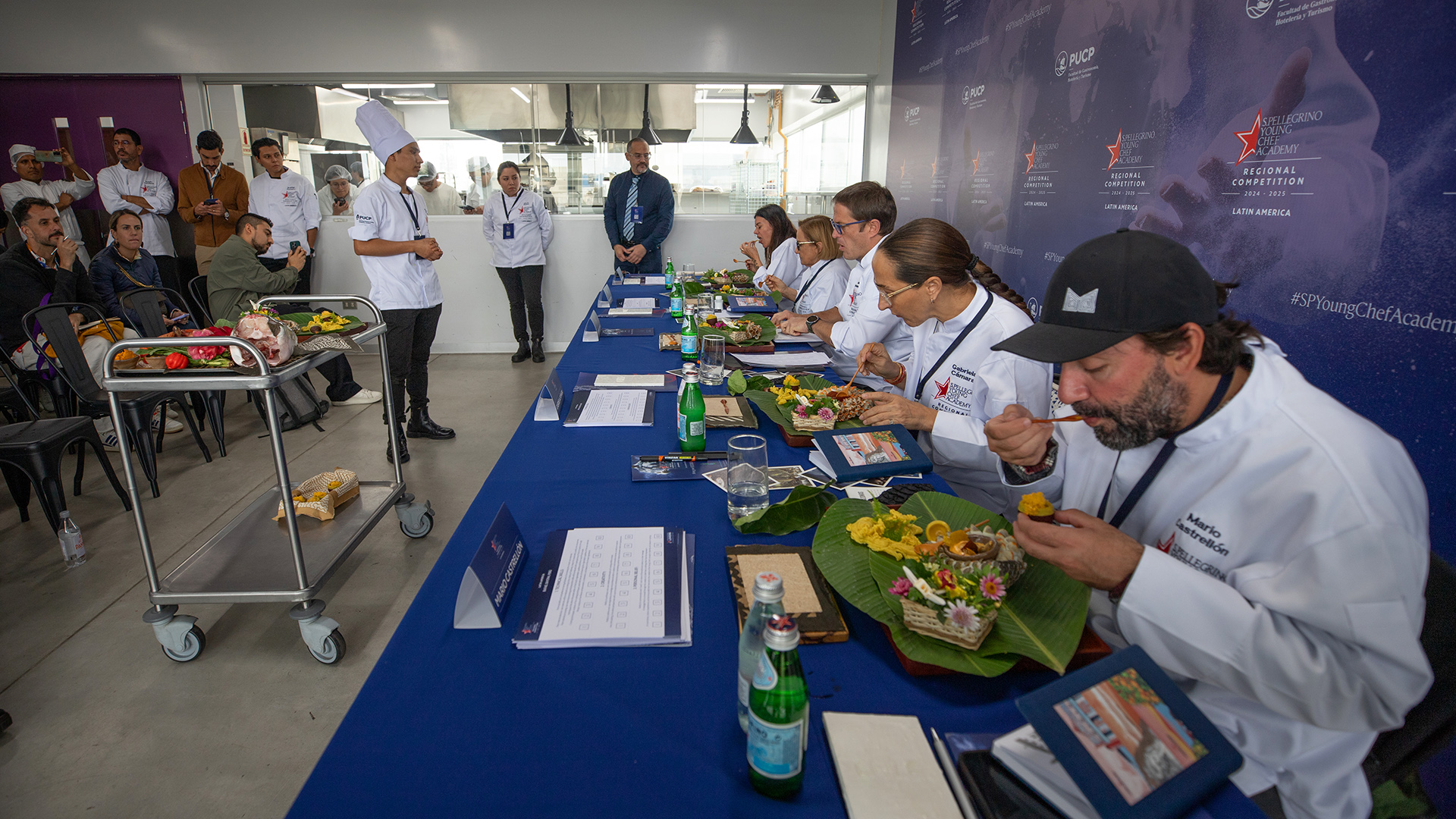 15 talentosos cocineros de América Latina y el Caribe participaron en la final regional del S. Pellegrino Young Chef Academy.En 5 horas, prepararon los platos que presentaron ante un destacado jurado.Las cocinas de la Facultad de Gastronomía, Hotelería y Turismo de la PUCP fueron testigos del trabajo de los concursantes y sus asistentes.El jurado, compuesto por Dolli Irigoyen (Argentina), Gabriela Cámara (México), Janaína Torres (Brasil), Mario Castrellón (Panamá) y James Berckemeyer (Perú), degusta el plato “Amazonas” de Rafael Bayona.Gabriela Cámara, jurado de SPYCA, observa uno de los ingredientes del plato “Amazonas” del cocinero peruano, sous chef de Central.Las emociones tras el largo trabajo estuvieron a flor de piel.Estudiantes de Gastronomía PUCP aplaudieron la presentación de cada plato de comida de los concursantes en la final regional SPYCA.