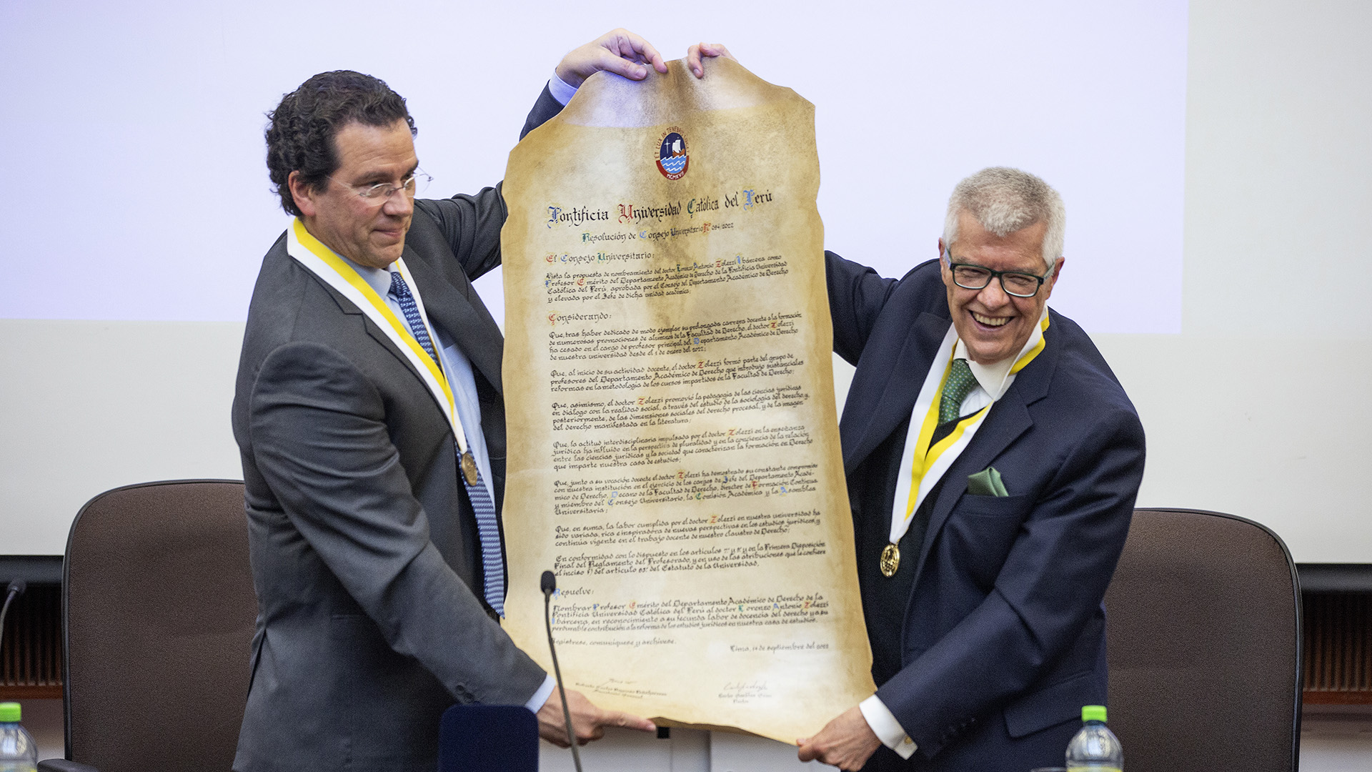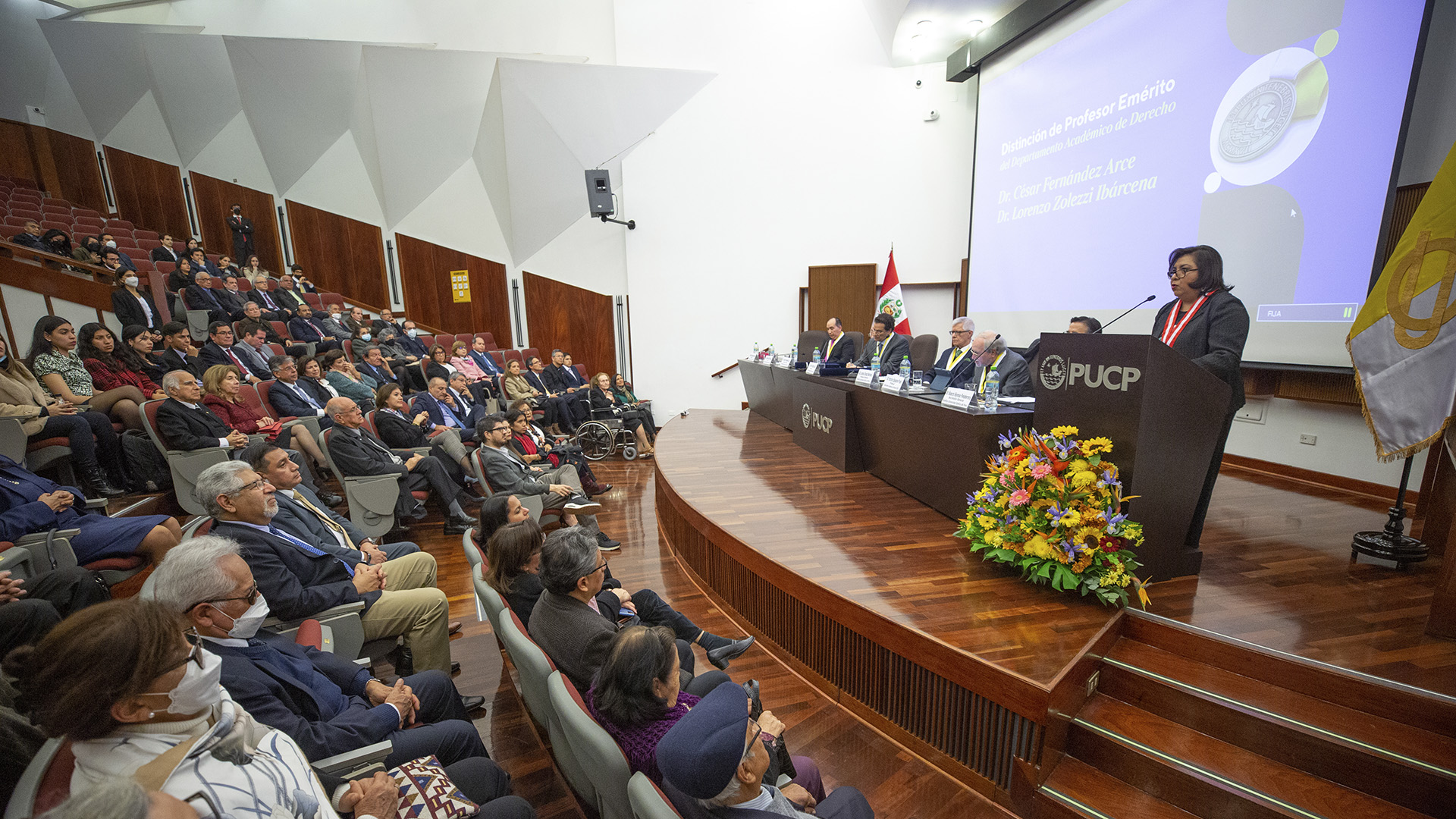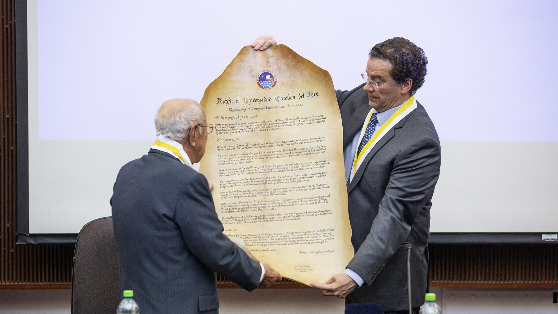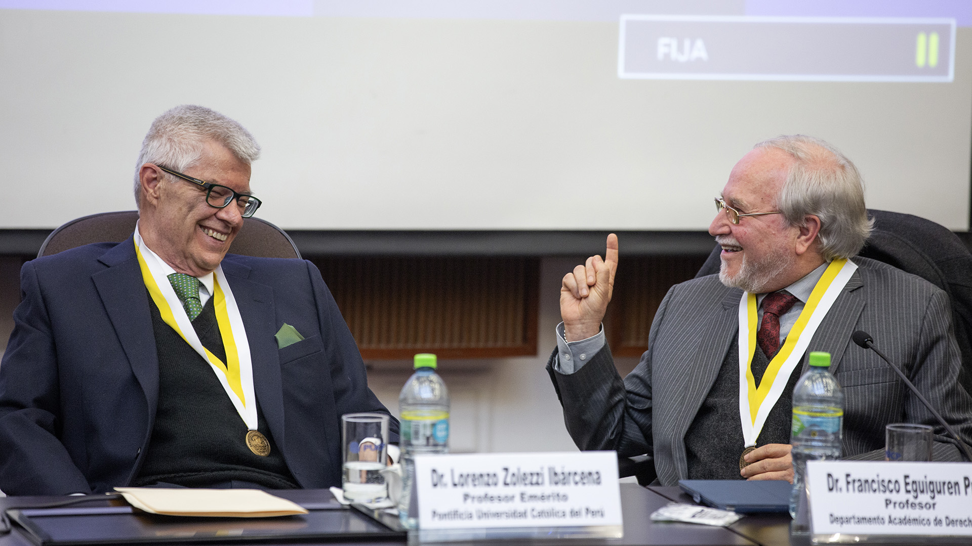 Este martes 18 de octubre se concedió la distinción de profesor emérito de la PUCP a los abogados César Fernández Arce y Lorenzo Zolezzi. El paso de ambos por las aulas de la Facultad de Derecho y el campus ha dejado una honda huella. De un lado, el Dr. Zolezzi es un reconocido jurista que ha profundizado en temas como la relación entre derecho y sociedad, derecho y literatura, la investigación empírica y la enseñanza del derecho; en el caso del Dr. Fernández, además del quehacer docente, destaca por su labor como magistrado del Poder Judicial por más de treinta años, donde llegó a ser presidente de la Corte Suprema.