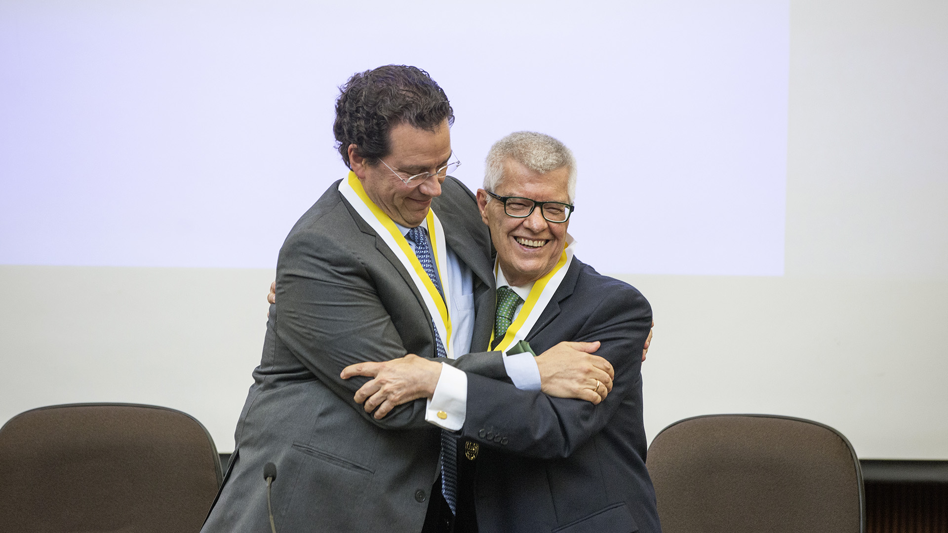 Antes de imponer las medallas y hacer entrega de las diplomas con la resolución del Consejo Universitario que acredita a ambos maestros como profesores eméritos del Departamento Académico de Derecho de la PUCP, el rector les dedicó unas sinceras palabras.
