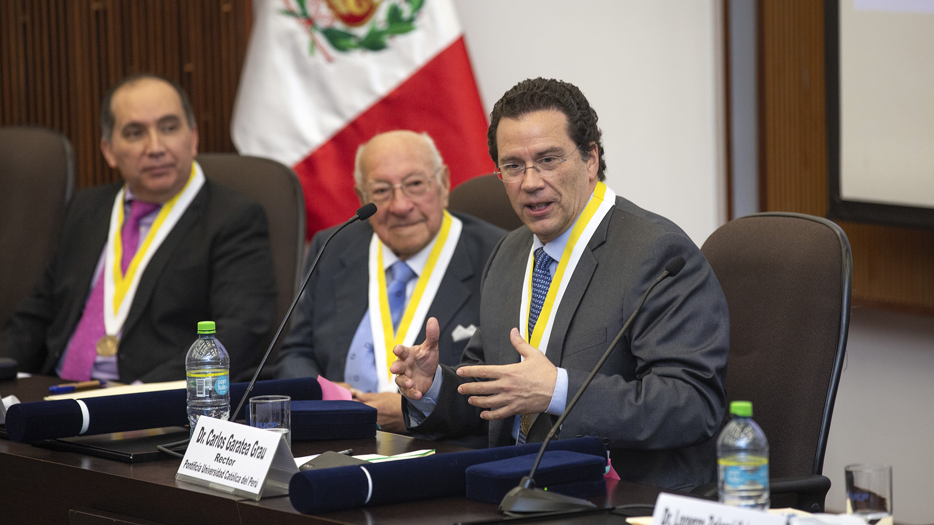 “Por primera vez, desde que tengo el honor de ser rector, estoy entre dos personas que han sido mis profesores. Cuando empecé, no estaba seguro de que el derecho era mi vocación, tuve una suerte de prejuicios. Uno de ellos era que los abogados no leían y yo quería hacer literatura. El profesor Zolezzi me hizo cambiar de opinión: en clase citó a Kafka, Dostoievski y luego a Borges. El prejuicio cayó. Vi esa preocupación por el razonamiento crítico sobre el derecho. Con el profesor Fernández Arce, mi experiencia fue distinta. Aprendí que el derecho tenía como eje al ser humano, había que preocuparnos por las personas”, expresó el Dr. Carlos Garatea.