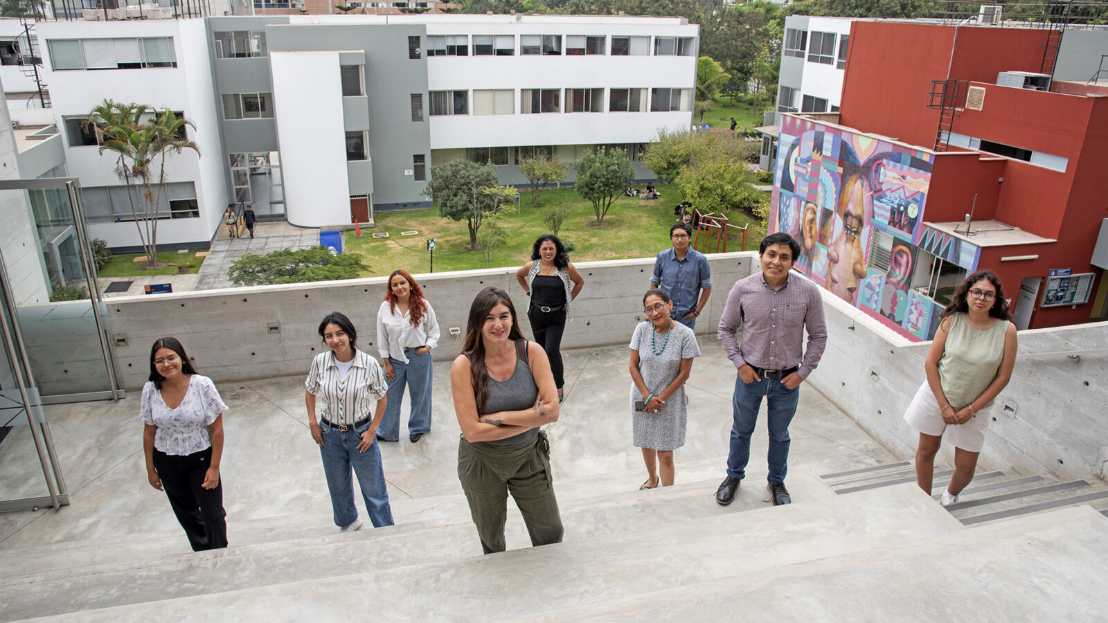 El equipo del Cisepa está integrado, de izquierda a derecha, por Ingrid Pacheco, practicante de Difusión Académica; Claudia Vera, asistente de Formación Continua; Dra. Paola Patiño, directora ejecutiva; Dra. Elizabeth Vallejos, administradora; Diego Retamozo, coordinador de Formación Continua; Karen Ruiz, practicante de Difusión Académica. Más atrás se encuentran Gisela Chacaltana, especialista en comunicaciones; Clariluz Castellares, asistente administrativa; Fabián Calla, asistente de gestión de proyectos. Asimismo, Marcos Castro es coordinador de Gestión y Monitoreo de Proyectos.