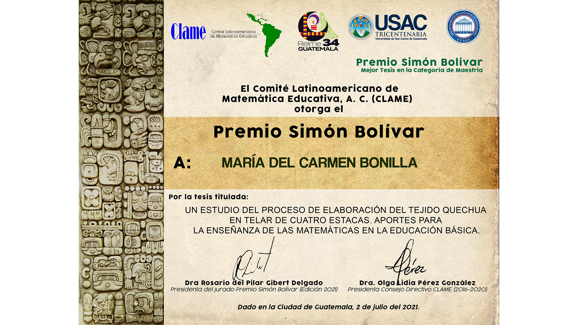 María del Carmen Bonilla obtuvo el Premio Simón Bolívar a la Mejor Tesis de Maestría. La investigadora es magíster en Enseñanza de la Matemática y bachiller en Educación por la PUCP. Para sus investigaciones sobre el tejido de la unqhuña en cuatro estacas, María del Carmen realizó largas visitas a comunidades puneñas. Hizo un recorrido por escuelas de la zona. Las tejedoras de las comunidades de Machacmarca y Llalli, en Puno, le mostraron cómo se realiza el tejido del manto conocido como unqhuña. En su elaboración, se integran nociones matemáticas valiosas.Con el apoyo de las tejedoras, la educadora filmó y anotó el proceso del tejido de la unqhuña en cuatro estacas. La educadora egresada de la PUCP viajó a Francia para presentar sus hallazgos a expertas como Corine Castela.María del Carmen teje una unqhuña junto con la investigadora francesa Corine Castela, especialista en la teoría antropológica de lo didáctico. Panorama de una de las comunidades puneñas que Bonilla visitó para su investigación. Hace falta apoyo del Estado para mejorar la infraestructura y las condiciones de enseñanza de las escuelas rurales. Los niños de nuestras comunidades quechuahablantes podrían aprender mejor las nociones matemáticas si observan su relación con actividades cotidianas, como el tejido, la arquitectura, o las manifestaciones artísticas de su cultura. En julio, María del Carmen Bonilla fue reconocida con el Premio Simón Bolívar a la Mejor Tesis de Maestría, otorgado por Clame.