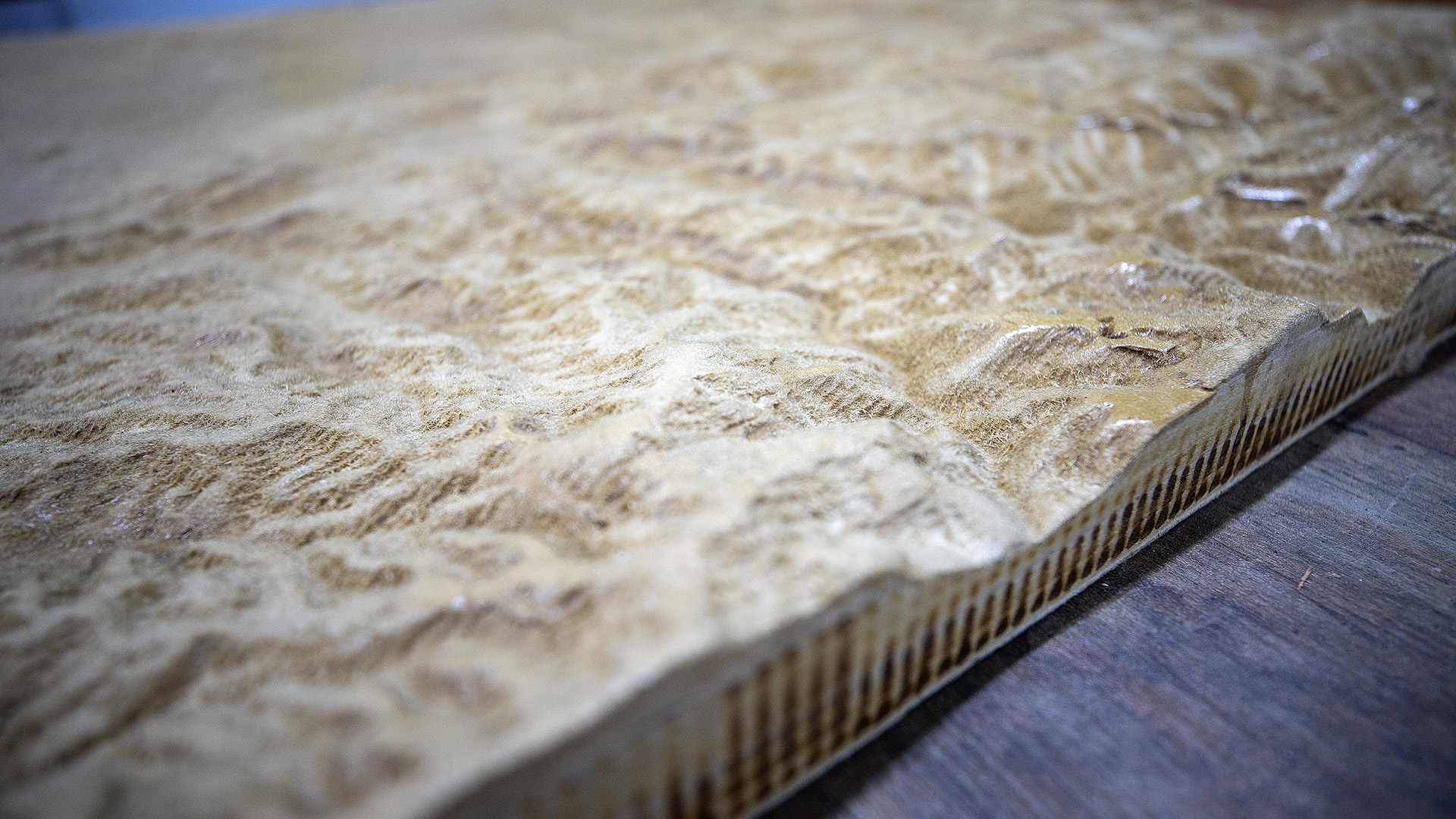 “La máquina ha ido construyendo la maqueta capa a capa, línea a línea. Se empezó con una broca gruesa para encontrar el volumen de la pieza, luego una broca más delgada para darle la redondez y la forma, y finalmente una broca más fina para los acabados y detalles. Terminamos las cuatro partes y las mandamos a pintar. Pasó por supervisión del MALI e hicimos unos retoques. Trabajé con una mesa que tiene un taladro. Tuve que pulir las esquinas y darle un boleado con la máquina Tupi para que diera esa sensación de mapa, que era lo que estaba buscando el artista”, explica Alonso Meza, técnico del laboratorio quien participó del proceso.