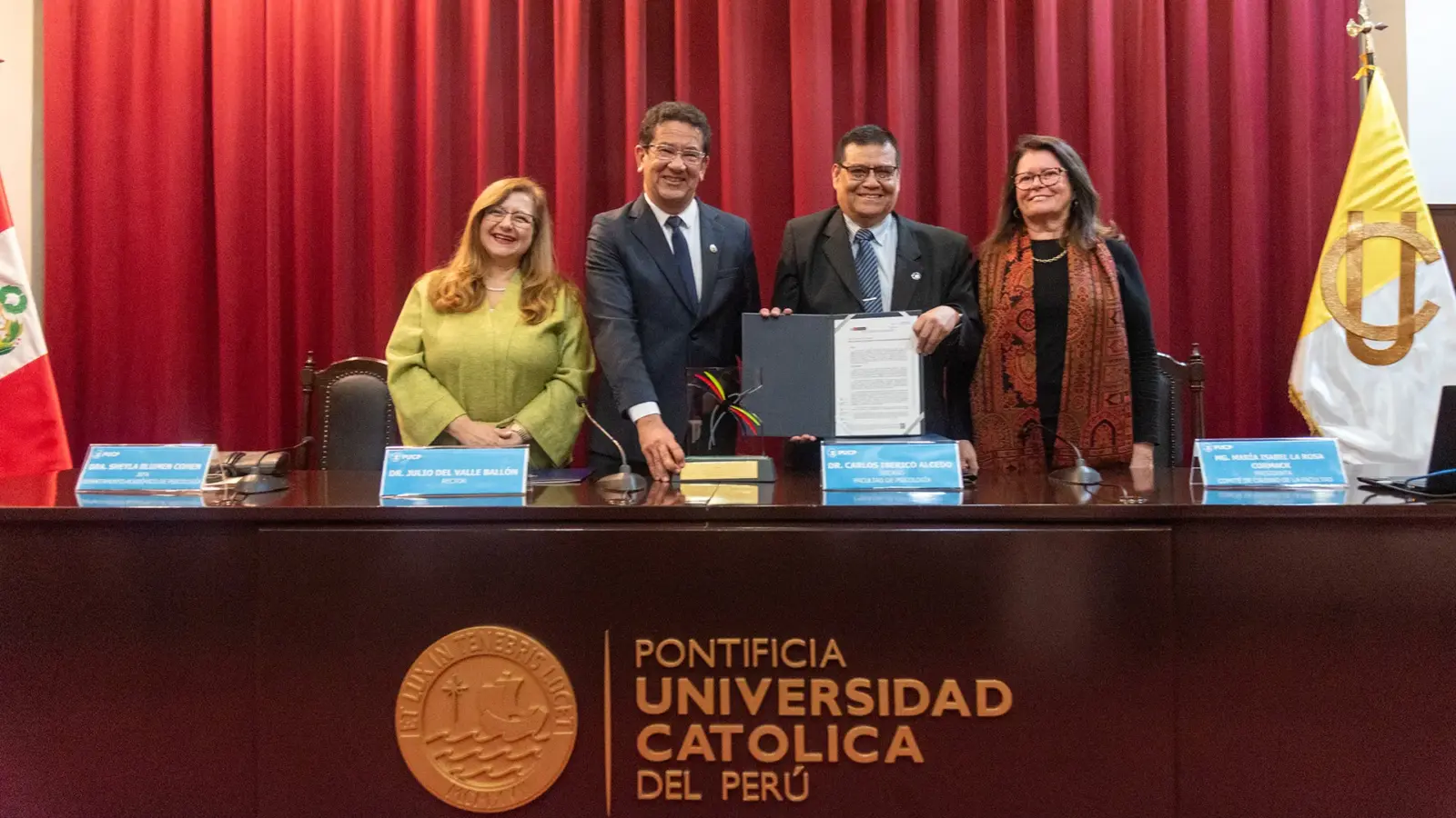 Psicología PUCP recibió el diploma de la acreditación brindada por Sineace. En la foto, están la jefa del Departamento de Psicología, Dra. Sheyla Blumen; nuestro rector, Dr. Julio del Valle; el decano de Psicología, Dr. Carlos Iberico; y la presidenta del Comité de Calidad, Mag. María Isabel La Rosa.