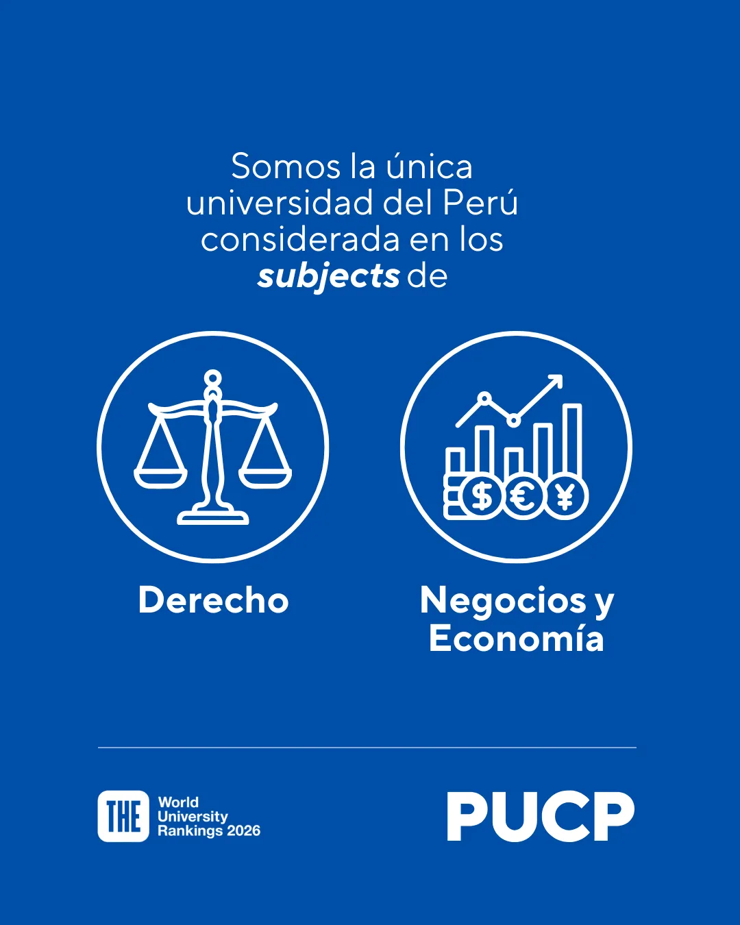 No solo la PUCP ocupa el primer lugar a nivel nacional en todos los subjects en los que participa, sino que somos la única universidad considerada a nivel nacional en las áreas temáticas de Derecho, y de Negocios y Economía.