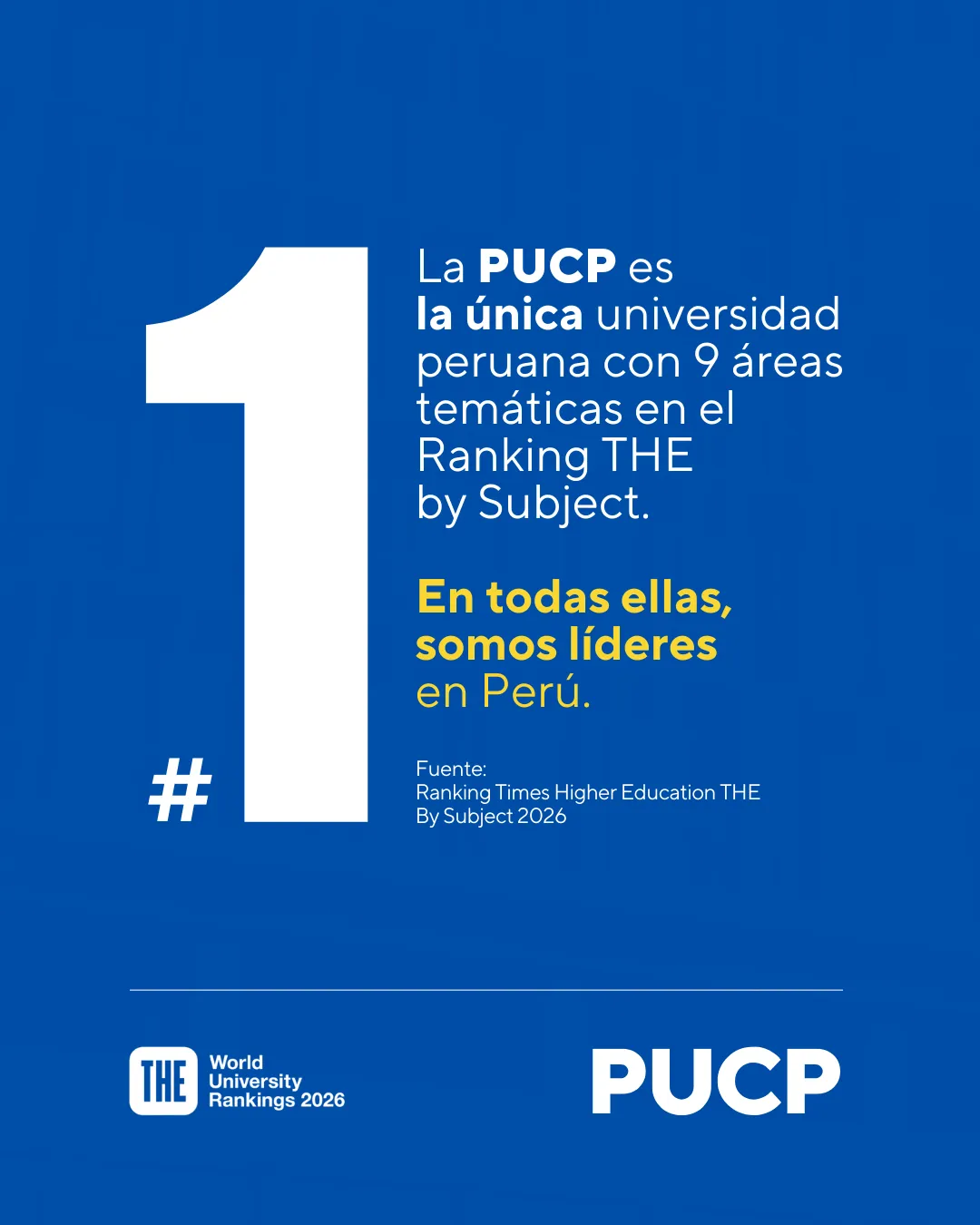 La PUCP es la mejor universidad del Perú en 9 áreas temáticas, según el ranking By Subject 2026, de Times Higher Education (THE): Ingeniería, Derecho, Ciencias Sociales, Negocios y Economía, Educación, Ciencias Físicas, Artes y Humanidades, Ciencias de la Computación, y Psicología.