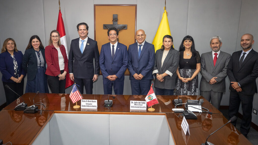 Estados Unidos es un socio clave en investigación para la PUCP. Para continuar fortaleciendo esta relación, con miras a un mediano y largo plazo, el embajador de los Estados Unidos en Perú, Mag. Bernie Navarro, visitó el 10 de abril nuestro campus para reunirse con el rector, Dr. Julio del Valle. En la reunión participaron,