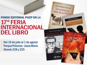 El Fondo Editorial PUCP participará en la 17° Feria Internacional del Libro, que se realiza hasta el 1 de agosto en el Parque Próceres de Jesús María. Podrás encontrar las publicaciones de la PUCP en los stands 228 y 225.