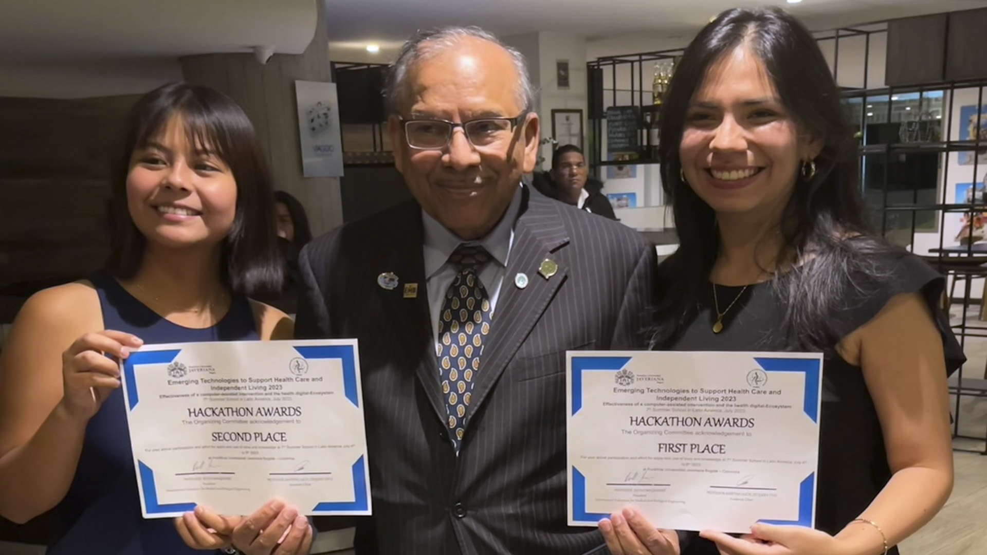 El desempeño de nuestra delegación PUCP llevó a que Ingeniería Electrónica PUCP reciba un reconocimiento de la Universidad Javeriana por su aporte incentivando el desarrollo de tecnología en alumnos de pregrado.
