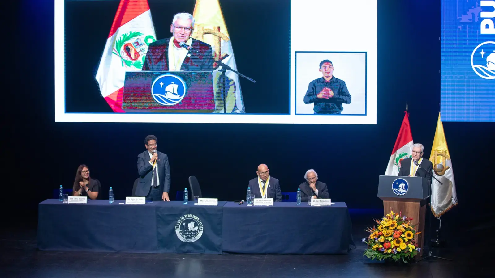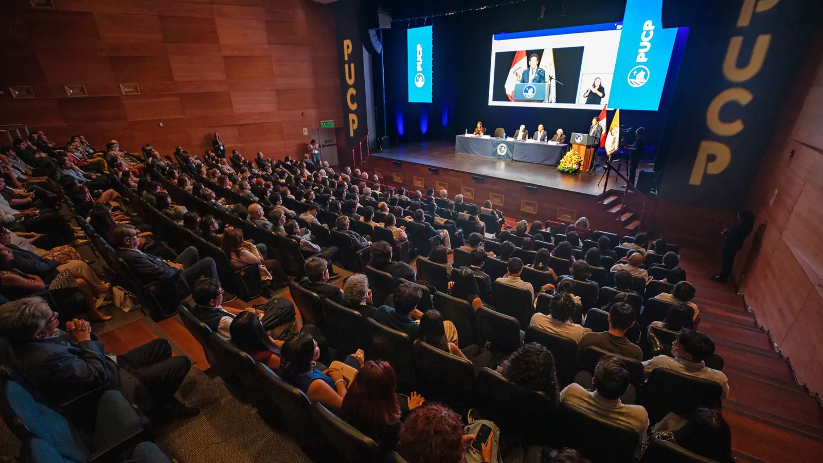 Nuestro rector, Dr. Julio del Valle; el vicerrector académico, Dr. Waldo Mendoza; el Gran Canciller de la PUCP y arzobispo de Lima, cardenal Carlos Castillo; el psicoanalista y secretario técnico del Acuerdo Nacional, Dr. Max Hernández; y la representante estudiantil ante la Asamblea Universitaria (REA), Carla Sabrera, tomaron la palabra en un auditorio conformado por estudiantes, docentes, personal administrativo y autoridades, como el vicerrector de investigación, Dr. Eduardo Ísmodes; la vicerrectora administrativa, Dra. Mónica Bonifaz; el nuncio apostólico en el Perú, Mons. Paolo Gualtieri; la embajadora de Alemania, Sabine Bloch; así como rectores del Consorcio de Universidades y de la Red Peruana de Universidades.