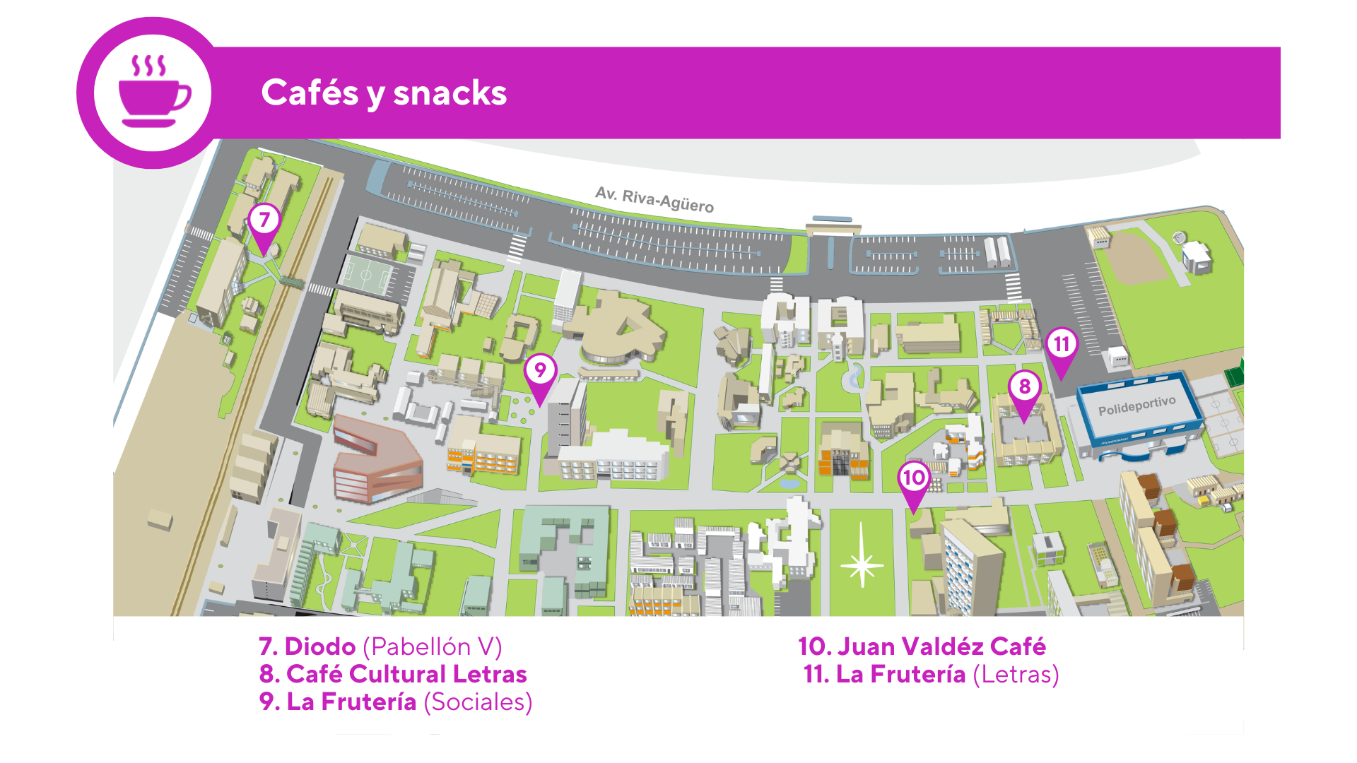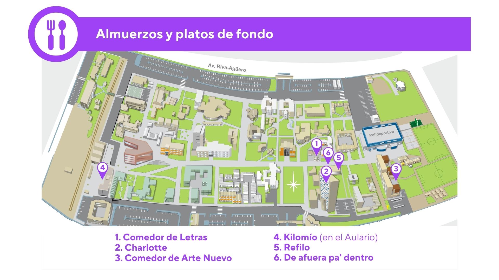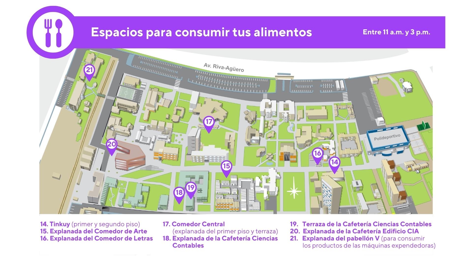 ¿Quieres saber qué comedores, cafeterías y quioscos estarán abiertos en la PUCP este 2022-2? Sea que vengas por unas horas o te quedes todo el día, volver a nuestro campus implica reencontrarnos en nuestros comedores y cafeterías. Aquí podrás conocer los 8 espacios para consumir tus alimentos, 6 puntos para comprar almuerzos o platos de fondo, 5 cafés, 3 quioscos y más de 90 máquinas expendedoras en todo el campus.