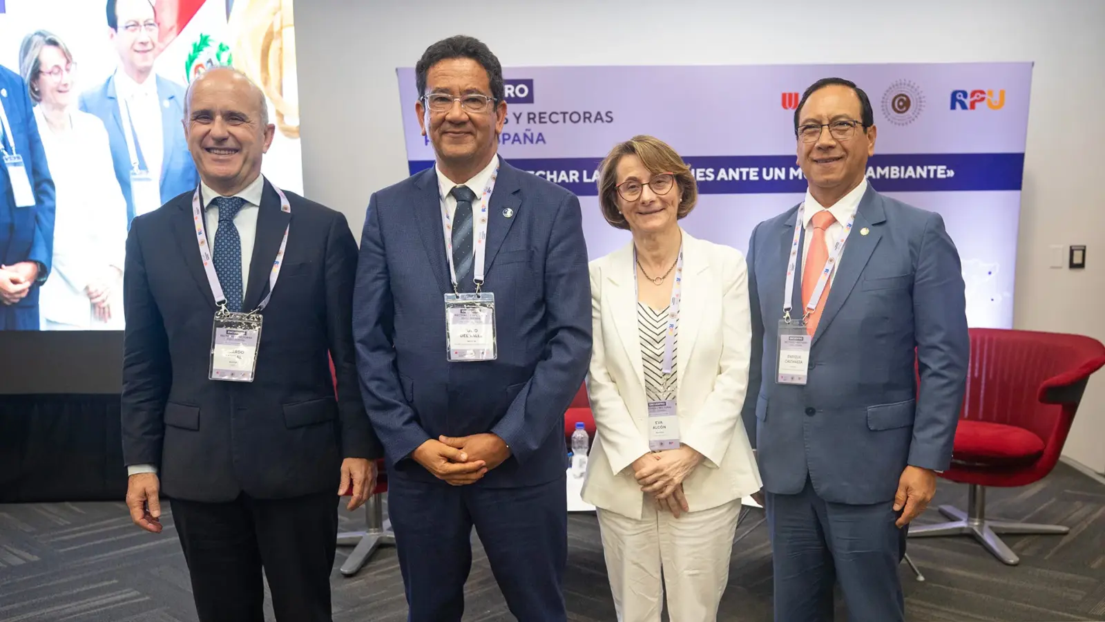 Por su parte, la delegación de universidades peruanas estuvo conformada por Dr. Julio del Valle, rector de la Pontificia Universidad Católica del Perú; Dra. Di – Yanira Bravo, rectora de la Universidad Andina del Cusco; Dr. Jorge Luis Cáceres, rector de la Universidad Católica de Santa María; Dr. Marcoantonio Pacherres, rector de la Universidad Católica de Trujillo Benedicto XVI; Dra. Carmen Lía Gálvez, vicerrectora académica de la Universidad Católica Santo Toribio de Mogrovejo; Dra. Patricia Stuart, rectora de la Universidad de Lima; Dra. Martha Chávez, rectora de la Universidad del Pacífico; Dr. Milthon Muñoz, rector de la Universidad Nacional Agraria de la Selva; Dr. Ángel Núñez, rector de la Universidad Nacional Daniel Alcides Carrión; Dr. Segundo Escalante, rector de la Universidad Nacional de Cajamarca; Dr. Edgardo Palomino, rector de la Universidad Nacional de Huancavelica; Dr. Juan Jara, vicerrector académico de la Universidad Nacional de la Amazonía Peruana; Dr. Hugo Marca, rector de la Universidad Nacional de Moquegua; Dr. Enrique Cáceres, rector de la Universidad Nacional de Piura; Dr. Eleazar Crucinta, rector de la Universidad Nacional de San Antonio Abad del Cusco; Dr. Emilio Ramírez, rector de la Universidad Nacional de San Cristóbal de Huamanga; Dr. Hermes Sifuentes, rector de la Universidad Nacional de Trujillo; Dr. Enrique Benites, rector de la Universidad Nacional de Tumbes; Dr. Edgardo Baúl, rector de la Universidad Nacional de Ucayali; Dr. César Ortiz, rector de la Universidad Nacional del Centro del Perú; Dr. Javier Lozano, rector de la Universidad Nacional Jorge Basadre Grohmann; Dra. Jeri Ramón, rectora de la Universidad Nacional Mayor de San Marcos; Dr. Mauro Huayapa, vicerrector académico de la Universidad Nacional Micaela Bastidas de Apurímac; Dr. Enrique Cárpena, rector de la Universidad Nacional Pedro Ruiz Gallo; Dr. Heraclio Castillo, rector de la Universidad Nacional Santiago Antúnez de Mayolo; Dr. Jorge Luis Maicelo, rector de la Universidad Nacional Toribio Rodríguez de Mendoza; y Dr. Enrique Castañeda, rector de la Universidad Peruana Cayetano Heredia.