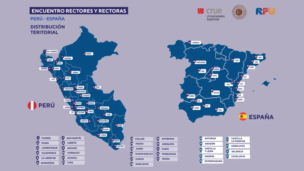 Este encuentro tiene un carácter histórico e inédito por la amplitud de su convocatoria: participaron universidades de 21 de las 25 regiones del Perú y de 9 de las 17 comunidades autónomas de España, un hecho que refleja la diversidad territorial y académica de los sistemas universitarios de ambos países.
