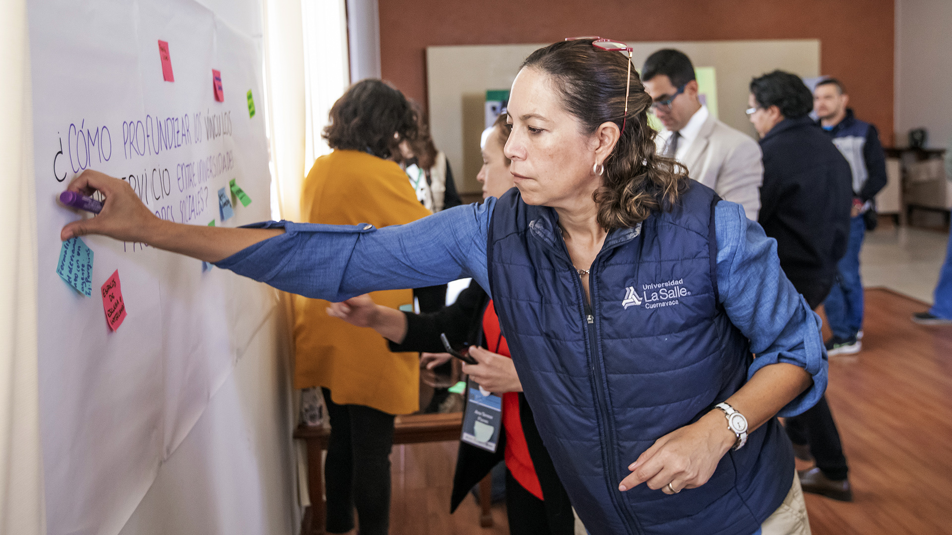 Espacios de escucha, participación equitativa, acercamiento a problemáticas in situ, diálogo, lenguaje humanitario, entre otras, fueron las propuestas que se escribieron en un papelógrafo que preguntaba cómo profundizar los vínculos de servicio entre universidades y actores sociales. Esta fue la última dinámica en la visita a Cáritas Lima.
