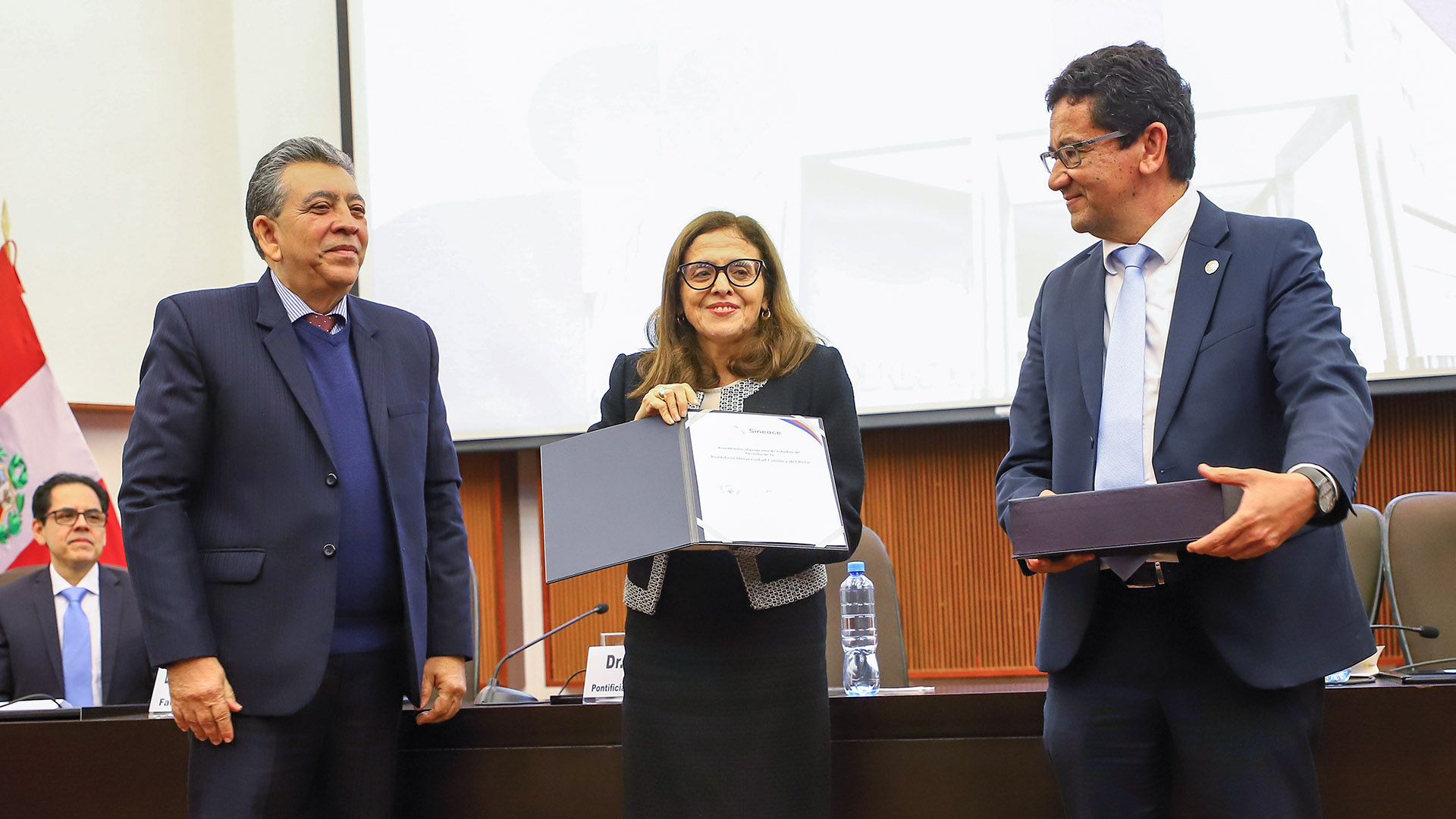 La Dra. Rocío Villanueva, decana de Derecho, y el Dr. Julio del Valle, rector de la PUCP, recibieron el certificado de acreditación del Sineace.