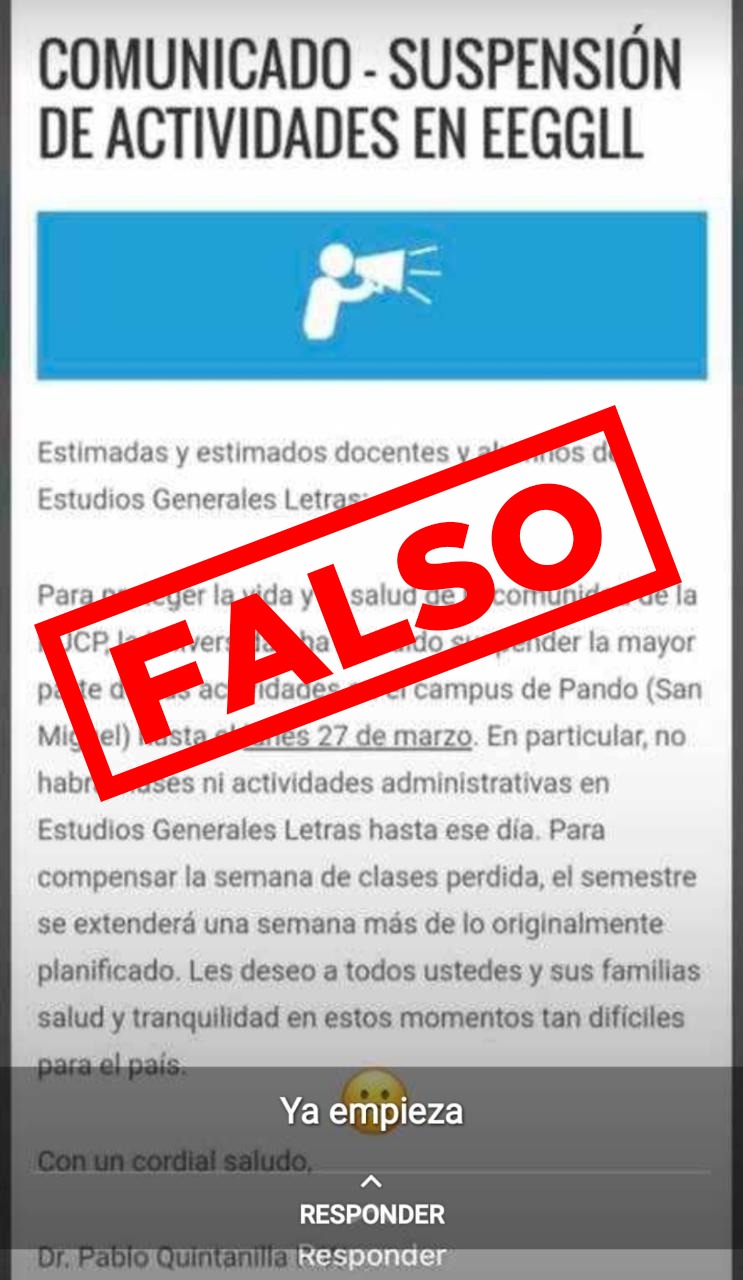 Hacemos un llamado a toda nuestra comunidad a ser responsables en el manejo de información y no compartir ni difundir este tipo de mensajes.