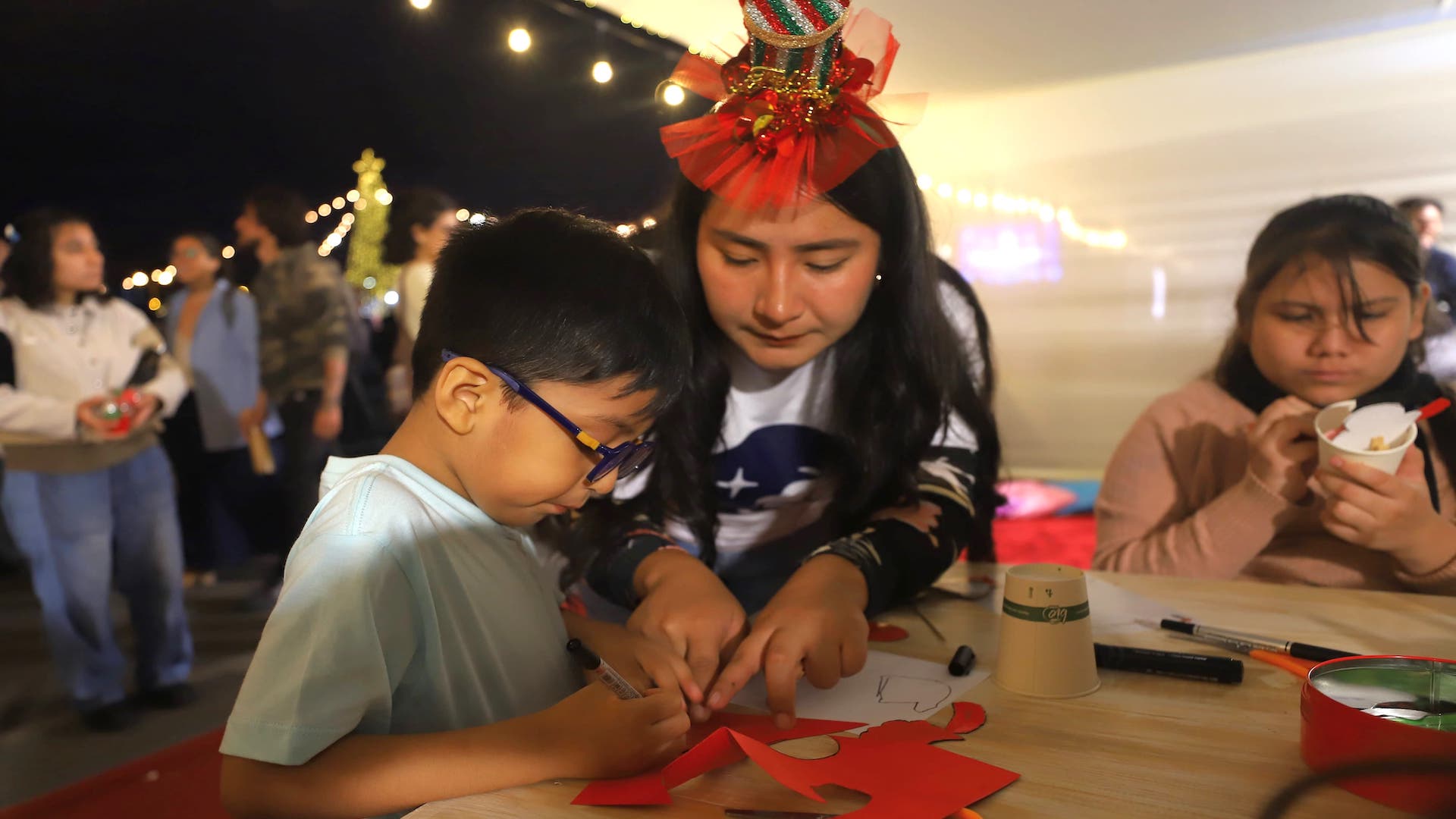 La jornada navideña en la PUCP se inició al final de la tarde, con el encendido de las luces del Pueblito de Luz, nuestra feria navideña, en la que resaltaron un hermoso árbol de navidad iluminado y los stands diseñados al estilo de retablos ayacuchanos.
