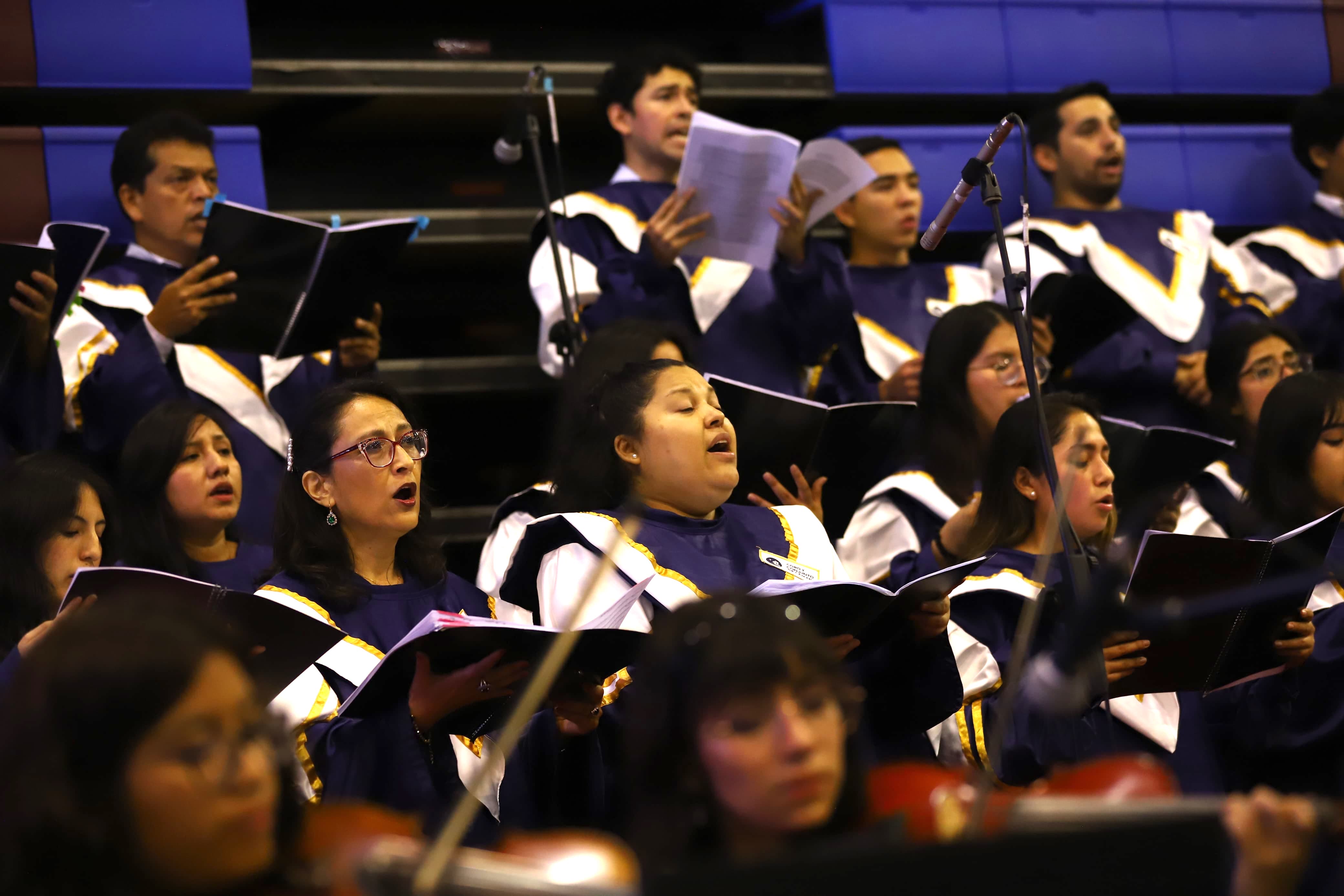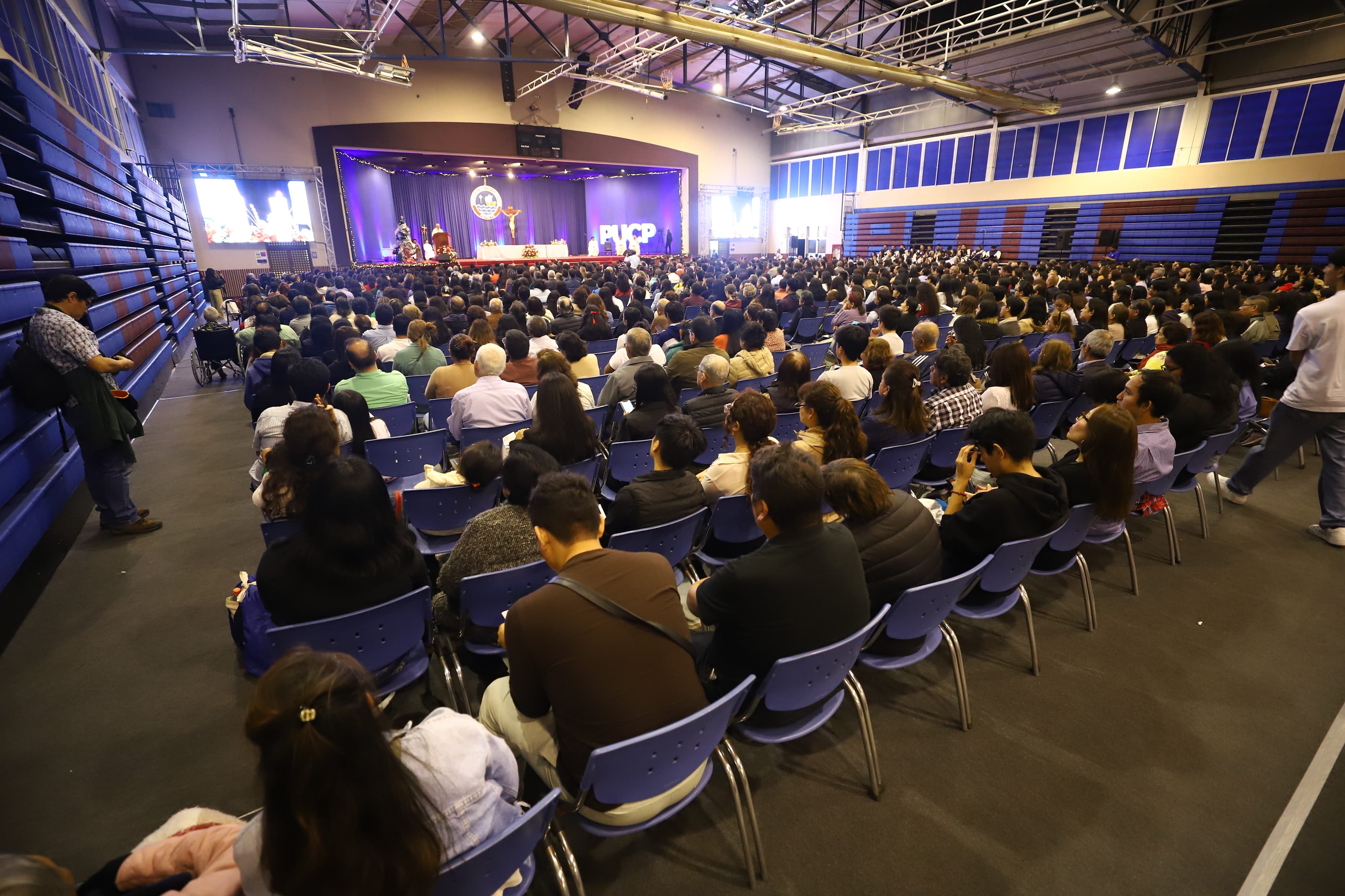 Con gran alegría, nuestra comunidad universitaria recibió al cardenal Castillo en el Coliseo Polideportivo, quien ingresó al recinto entre las palmas de la concurrencia y el popular villancico «Santa is Coming to Town», a cargo del Coro y Conjunto de Cámara PUCP, que entonó populares canciones navideñas durante la ceremonia.