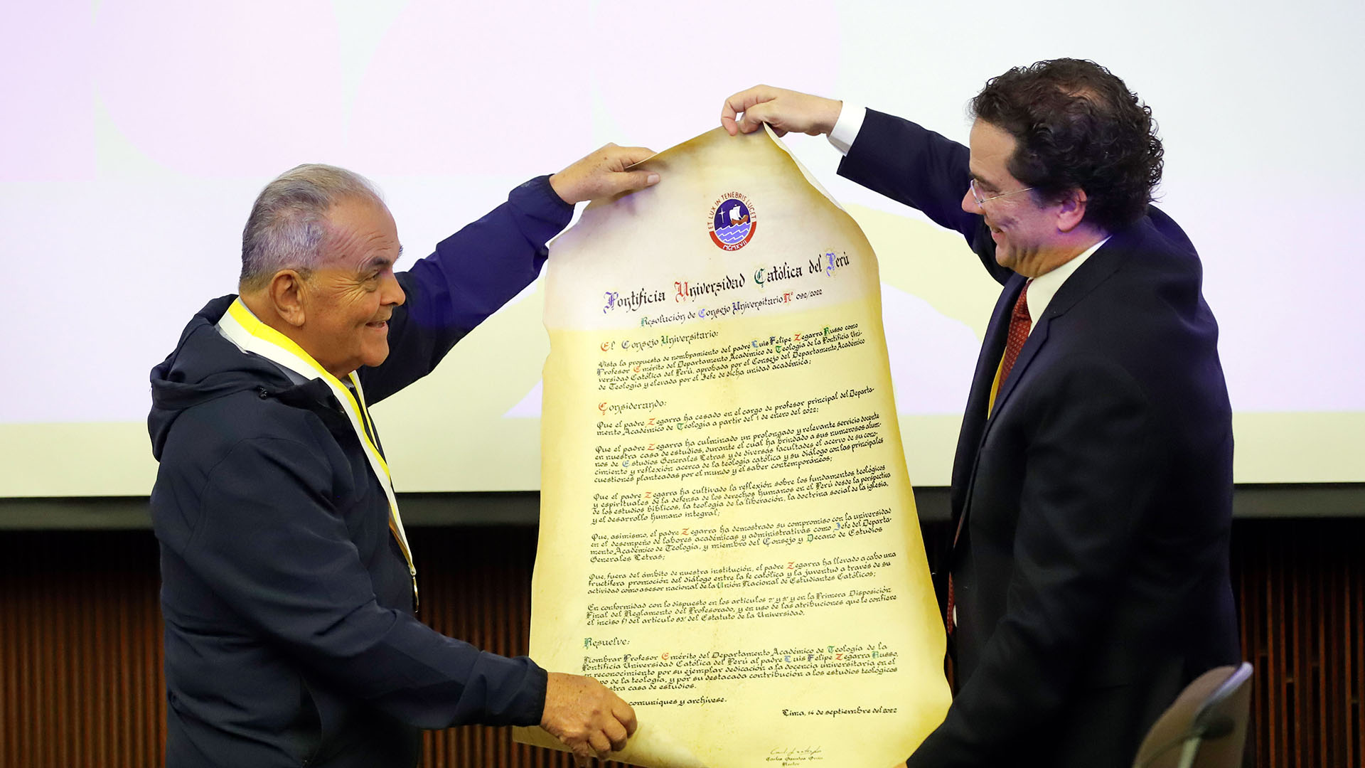 En junio del 2023, el padre Felipe recibió la distinción de profesor emérito del D.A. de Teología de la PUCP. Fue una manera de agradecerle por los más de 50 años de compromiso con nuestra Universidad y sociedad, dedicación a sus alumnos y aporte a la reflexión humanista desde la teología.