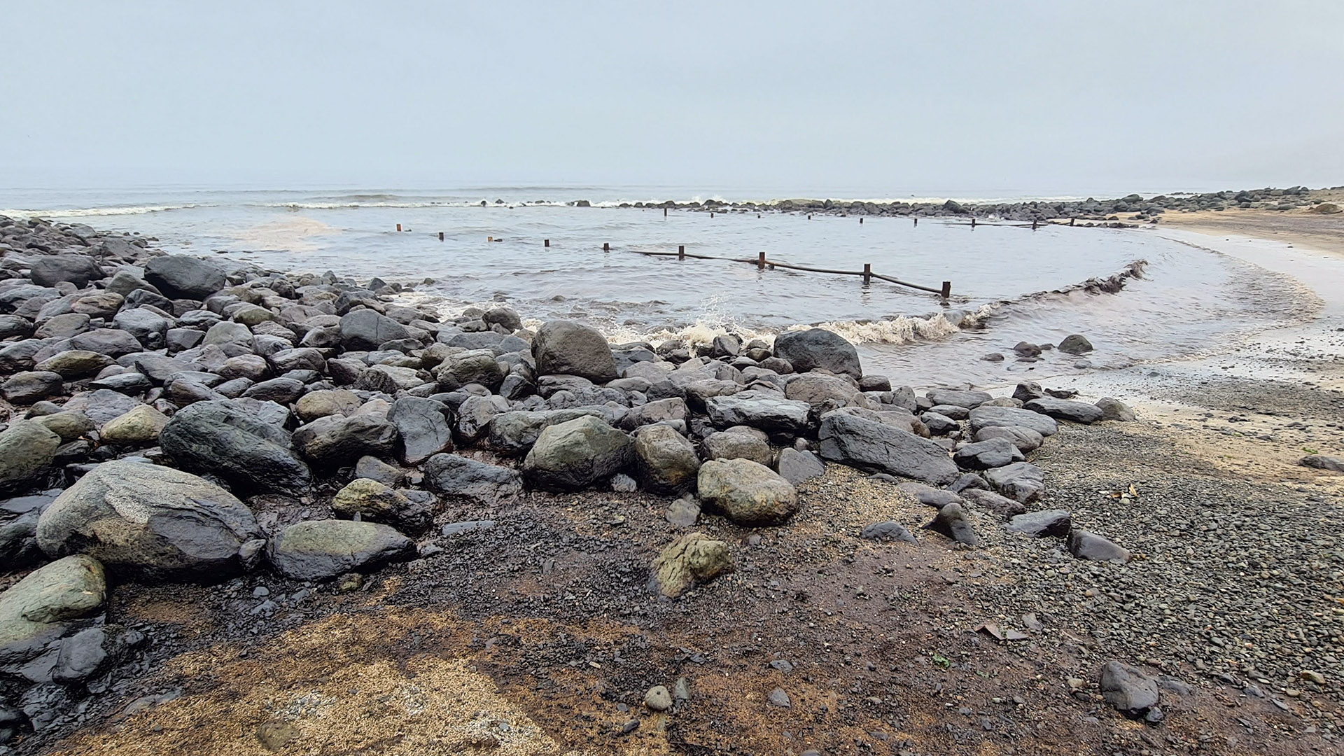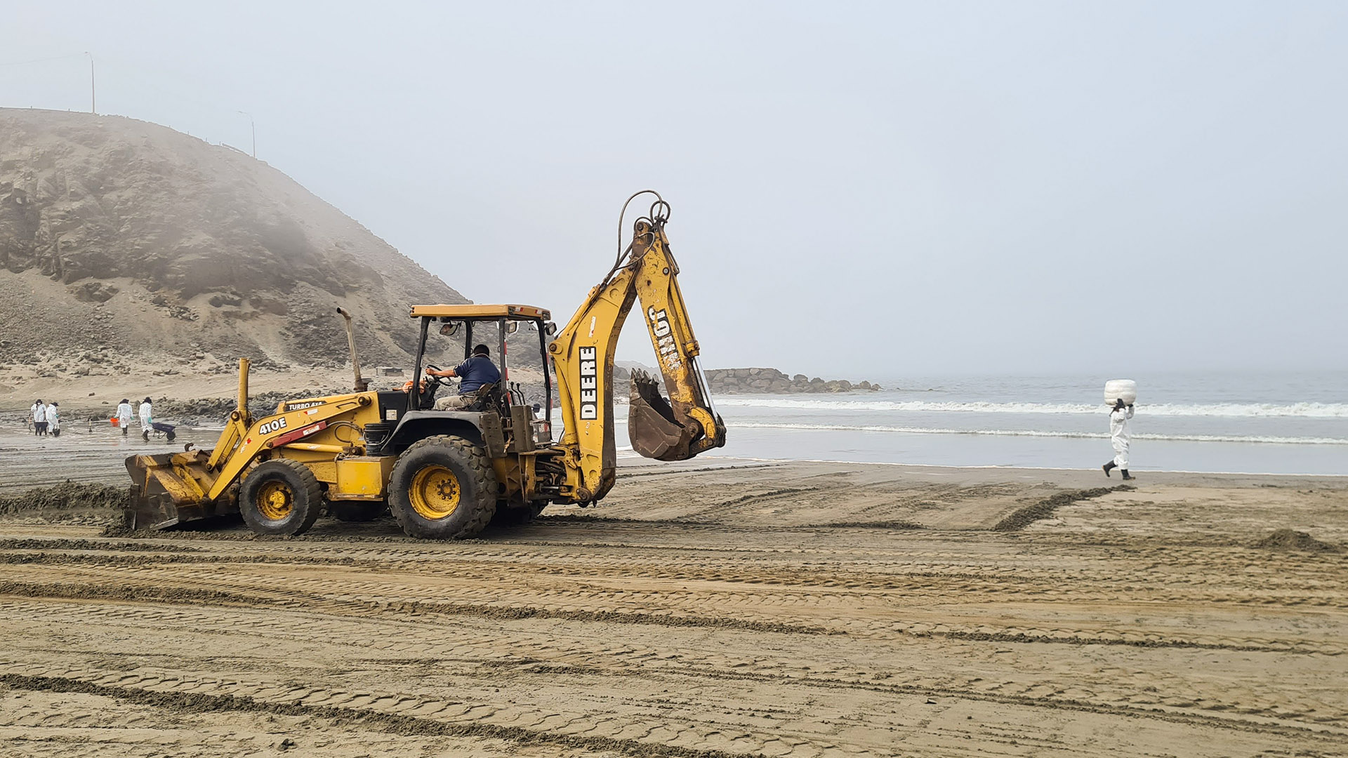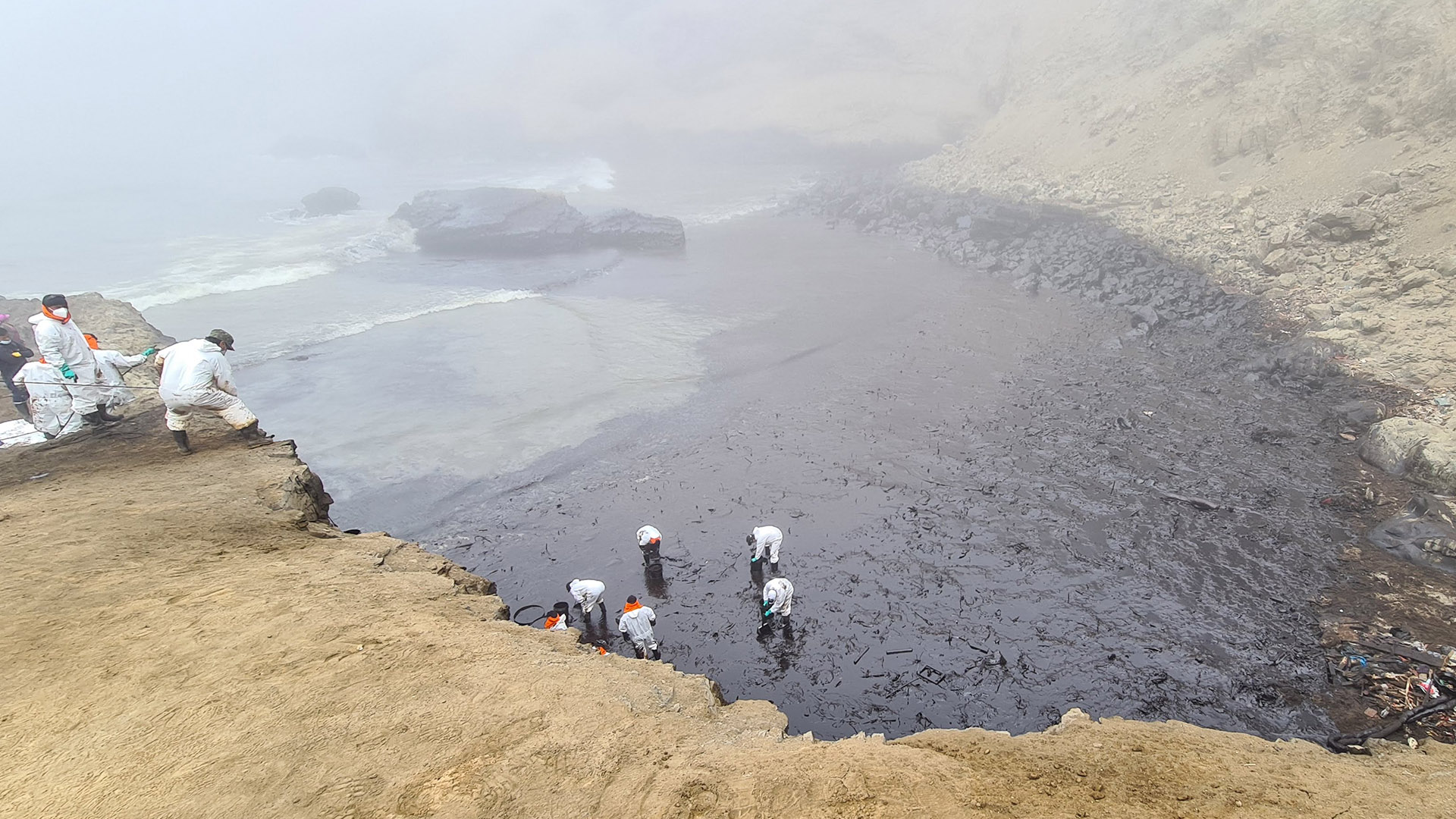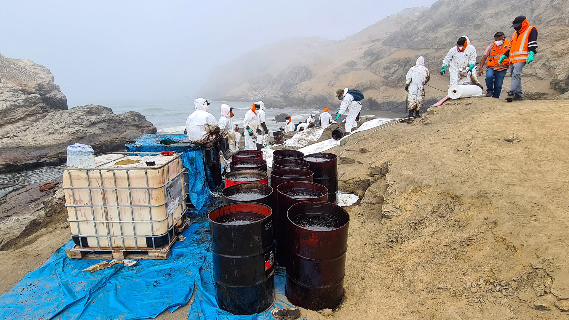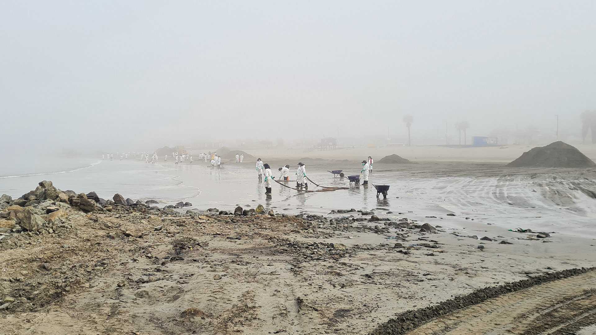 Tareas de recolección del combustible en la zona cero del desastre en la playa Cavero del distrito de Ventanilla. Fotografía: Eizo Muñoz.En la playa Santa Rosa, los investigadores de Pelcan observaron que se estaba utilizando absorbentes. Esta tecnología, como su nombre lo indica, es una especie de cilindro largo que absorbe el petróleo. En la playa Conchitas, se aprecia cómo el crudo ha llegado a la orilla y rocas. Nuestros investigadores sostienen que lo ideal es atacar la mancha negra contaminante en el mar y no esperar a que llegue a la costa.Trabajo de limpieza con maquinaria y personas en la playa Santa Rosa.Nuestro docente Ramzy Kahhat critica que habiendo tecnología idónea para remediar el derrame de petróleo -como booms, skimmers y dispersantes- se hayan utilizado baldes para recogerlo, como se aprecia en esta foto.