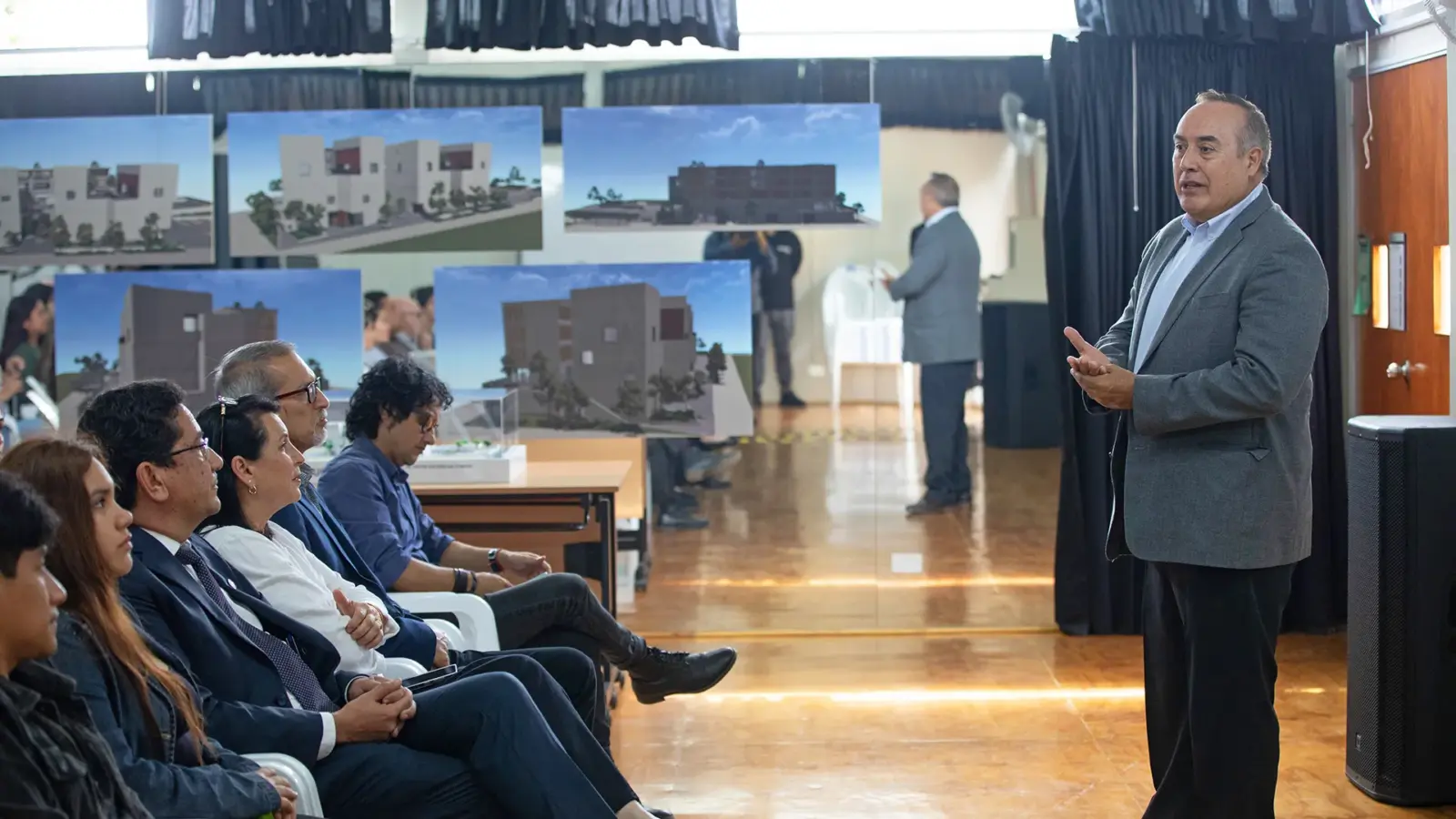 Por su parte, el Dr. Raúl Renato Romero, decano de la Facultad de Artes Escénicas, destacó el valor simbólico y académico de la presentación del inicio del proyecto. “Ahora contamos con una exposición permanente para que estudiantes y docentes de la facultad puedan conocer y visualizar el proyecto”, señaló. Asimismo, explicó que el nuevo diseño se basa en la propuesta del estudio Barclay & Crousse, ganadora del concurso arquitectónico realizado en 2022.
