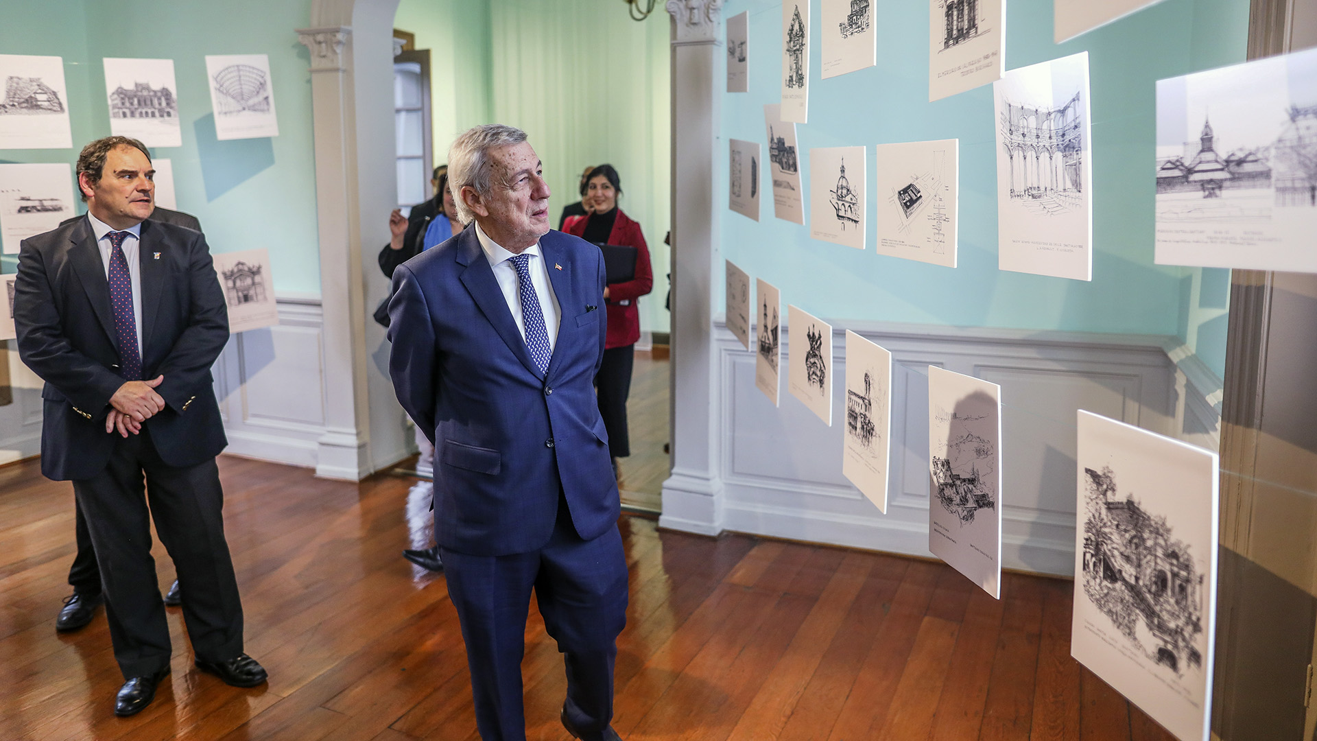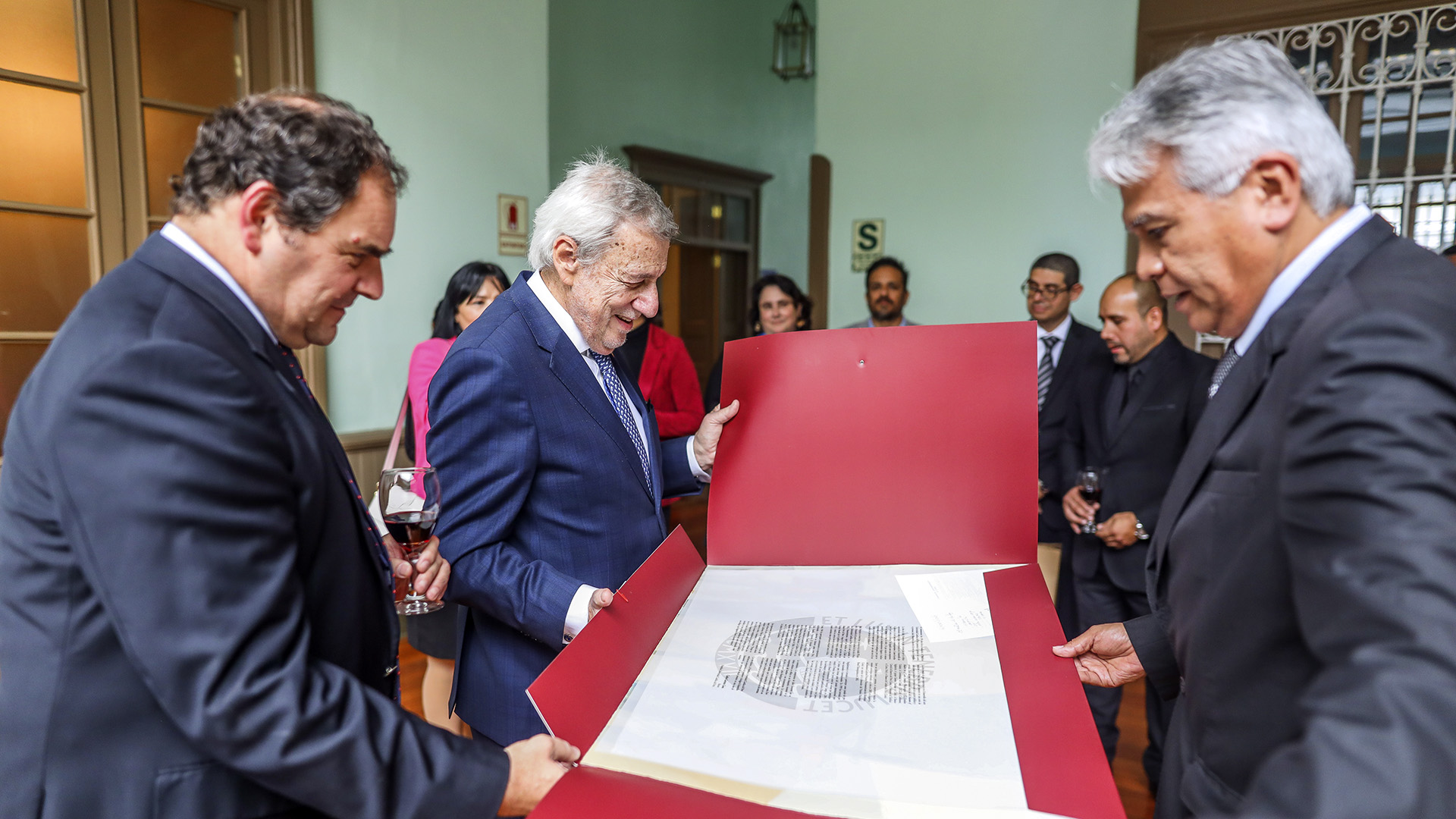 Siguiendo con la visita, las autoridades visitaron la Sala Azul, donde se encuentra instalada una cuidadosa selección de piezas de nuestro Museo de Artes y Tradiciones Populares, legado del recordado y muy querido museólogo Luis Repetto Málaga. Impactados por la belleza de los retablos, los visitantes pasaron a la terraza para realizar un brindis, celebrando la vinculación entre Perú y Chile, destacando el intercambio cultural entre las dos naciones. A su vez, el Dr. Panfichi y el Dr. Alvarez entregaron al canciller visitante sendos obsequios para conmemorar la visita.