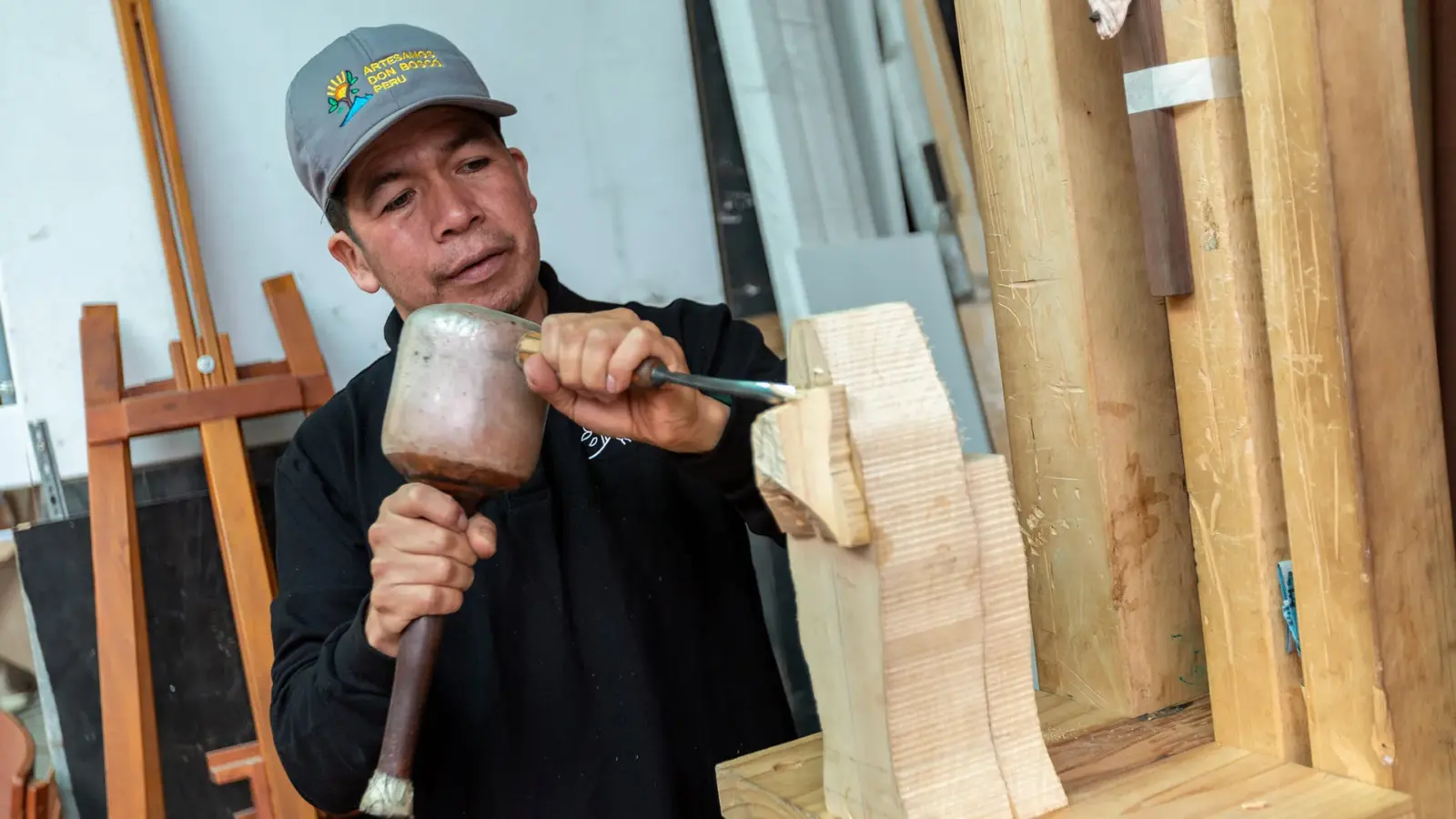 En el corazón de la obra de Morales está la madera lenga, un material claro, resistente y manejable que permite detalles minuciosos y acabados naturales. “Es muy resistente a la polilla y su color claro ayuda a visualizar mejor el trabajo”, explica. Aunque Perú posee maderas valiosas, como el cedro y el cedrillo, la lenga se convirtió en un sello de la Asociación Don Bosco, que comenzó a importarla desde Chile por su calidad y certificación sostenible. Morales recuerda entre risas que algunos visitantes chilenos comentaban que en su país se usa incluso para construcción; sin embargo, en las manos de los artesanos de Don Bosco, adquiere una dimensión artística y espiritual.