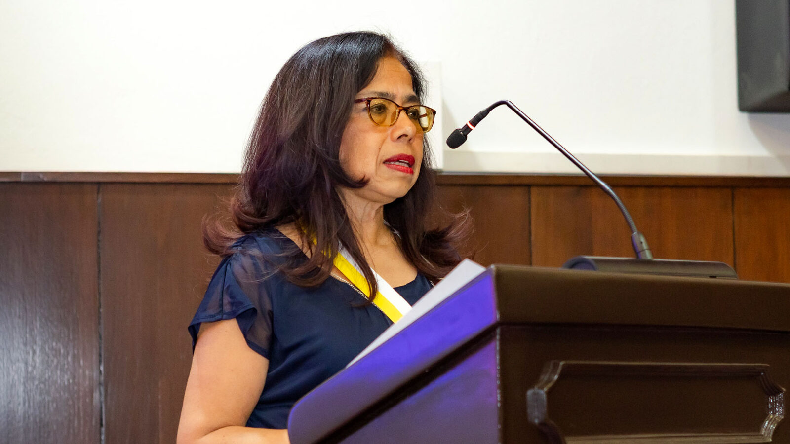 Las palabras de bienvenida estuvieron a cargo de Marcela Huaita, quien destacó la importancia de este encuentro para la memoria y la identidad institucional. “Hoy recordamos a las mujeres que por primera vez asumieron cargos de autoridad en la PUCP, y celebramos trayectorias y caminos que se han ido abriendo para que más mujeres participen en el liderazgo universitario”, dijo.