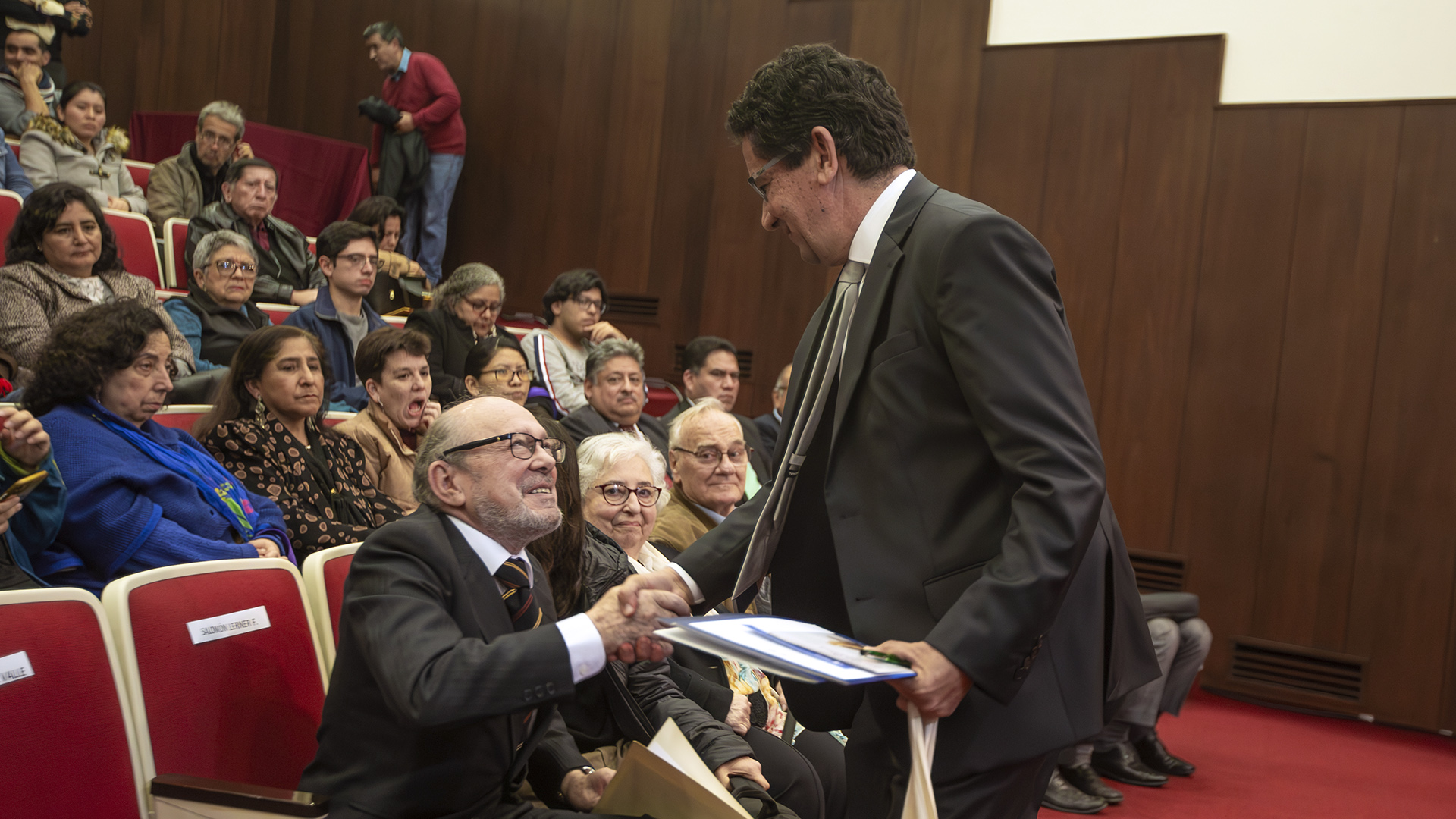 Todos los presnetes en el Auditorio de Humanidades se pusieron de pie para aplaudir y reconocer la labor por la defensa de los derechos humanos que ha ejercido a lo largo de su vida el maestro PUCP Dr. Salomón Lerner Febres. Con su característica humildad, subió al escenario para recibir el reconocimiento IDEHPUCP de manos del Dr. Giusti.