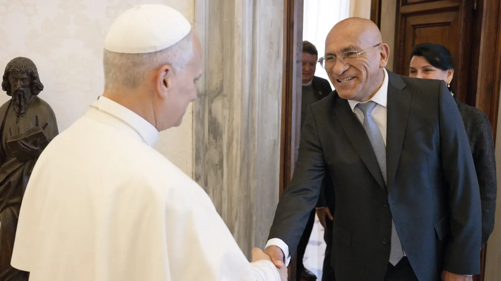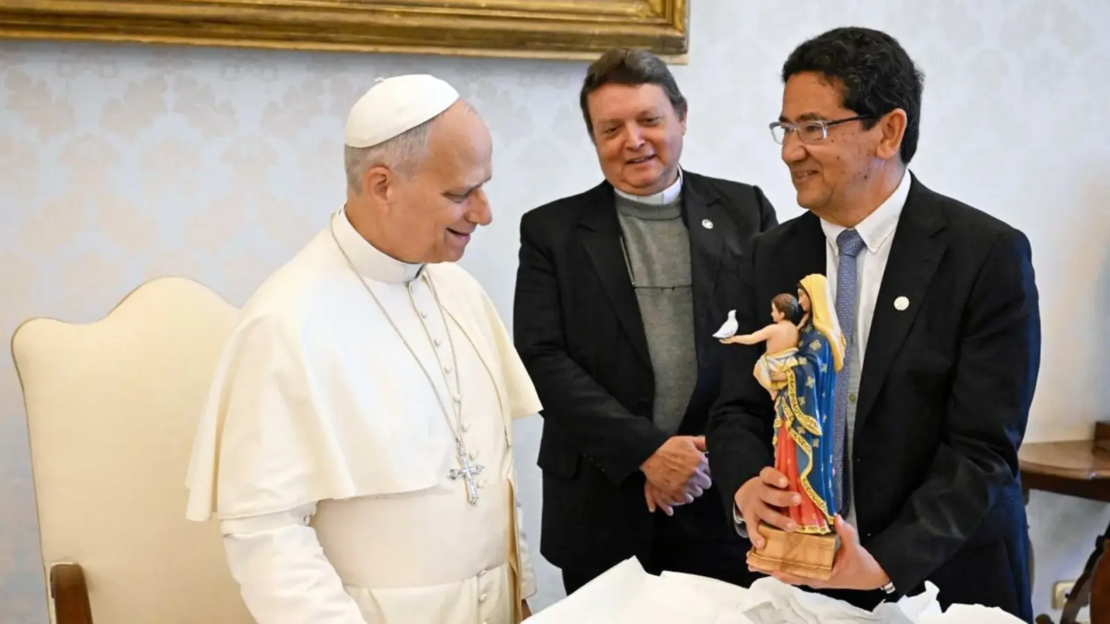 Durante la audiencia, los representantes PUCP compartieron con el Papa León XIV los esfuerzos institucionales por fortalecer la formación integral, trabajar por la inclusión educativa y contribuir con el país mediante la reflexión, el diálogo democrático y la construcción de consensos. Como gesto simbólico de ese compromiso, el rector entregó al Santo Padre una imagen de Nuestra Señora de la Paz. Esta obra del escultor Miguel Ángel Morales está inspirada en la imagen que está en la catedral de Chiclayo.
