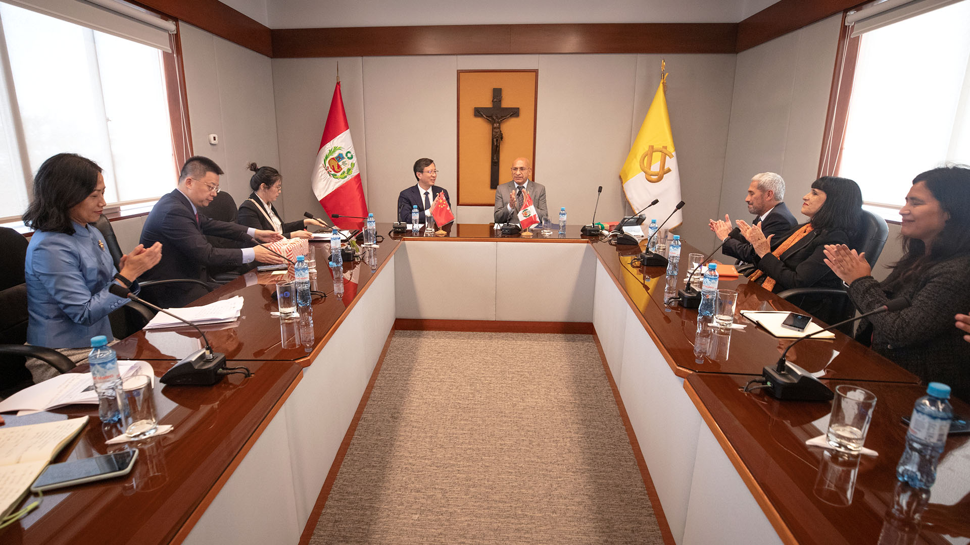 El Dr. Waldo Mendoza le expresó al viceministro Chen el gran interés de nuestra Universidad por aprender de la experiencia y el gran desarrollo educativo de China en las últimas décadas, así como aprovechar, de la manera más amplia posible, el reciente memorándum firmado entre los ministerios de Educación de Perú y China.
