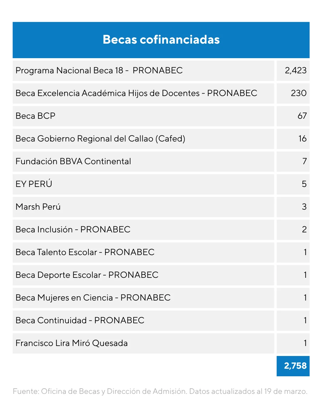 En paralelo se encuentran las becas cofinanciadas entre la PUCP e instituciones externas, entre ellas Beca 18 y otros programas gestionados por el Programa Nacional de Becas y Crédito Educativo (Pronabec), así como alianzas con el sector privado en las becas BCP, Fundación BBVA, EY Perú, Marsh Perú y Francisco Lira Miró Quesada.