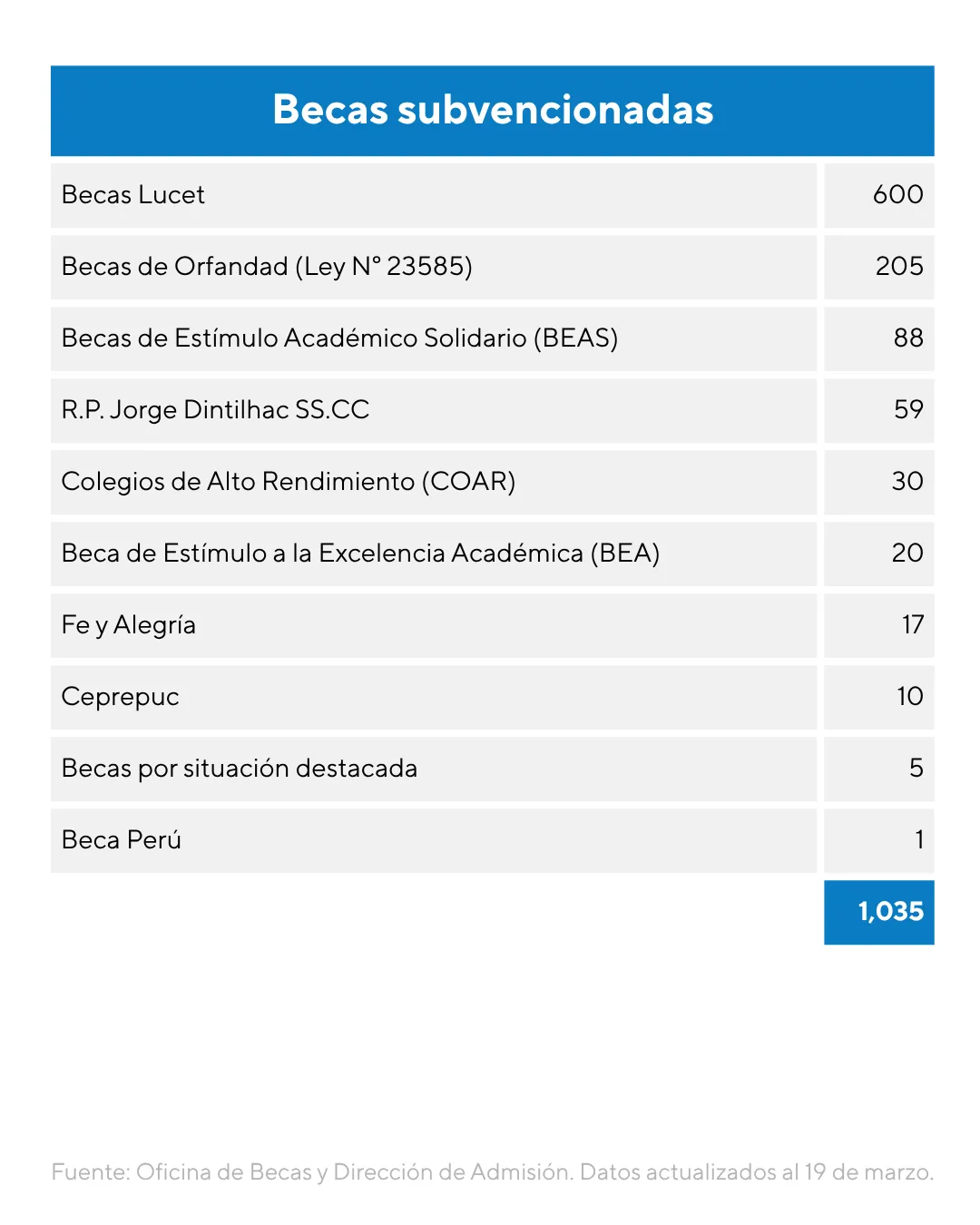 Actualmente, tenemos 3,793 becarios. “Las becas que ofrece la PUCP conforman un sistema diverso de apoyo orientado a ampliar oportunidades educativas y promover el talento académico”, explica Ivette Ruiz, jefa de la Oficina de Becas de la Dirección de Asuntos Estudiantiles (DAES). Para ello, nuestro sistema de becas combina programas que subvenciona directamente la PUCP, y otros desarrollados en convenio de cofinanciamiento con instituciones públicas y privadas. En el primer grupo se encuentran las Becas Lucet, la Beca de Estímulo a la Excelencia Académica (BEA), la Beca de Estímulo Académico Solidario (BEAS), la Beca para Deportistas Destacados (Becad), la Beca R.P. Jorge Dintilhac SS.CC., entre otras. A ellas se suman iniciativas vinculadas a programas específicos como Ceprepuc, COAR, y Fe y Alegría.